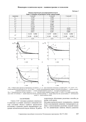 В статье представлены результаты решения задачи редукции многомерной математической модели химического реактора, которая используется в дальнейшем для синтеза системы управления температурным режимом аппарата. Проблема синтеза системы управления обусловлена многомерностью и нелинейностью исходной модели, отсутствием измерений текущих значений концентраций веществ. Преодоление указанных трудностей предполагает проведение линеаризации модели, её редукцию и синтез алгоритма управления на базе регулятора состояния пониженного порядка. Приводится теоретическое обоснование различных способов редукции полноразмерной линеаризованной модели реактора. Путем моделирования динамики процесса с использованием редуцированных различными способами моделей определено, что удовлетворительно свойства объекта описывает модель, редуцированная с использованием уравнений для коэффициентов чувствительности концентраций к изменению констант скоростей или с использованием уравнений статики для концентраций линеаризованной модели.