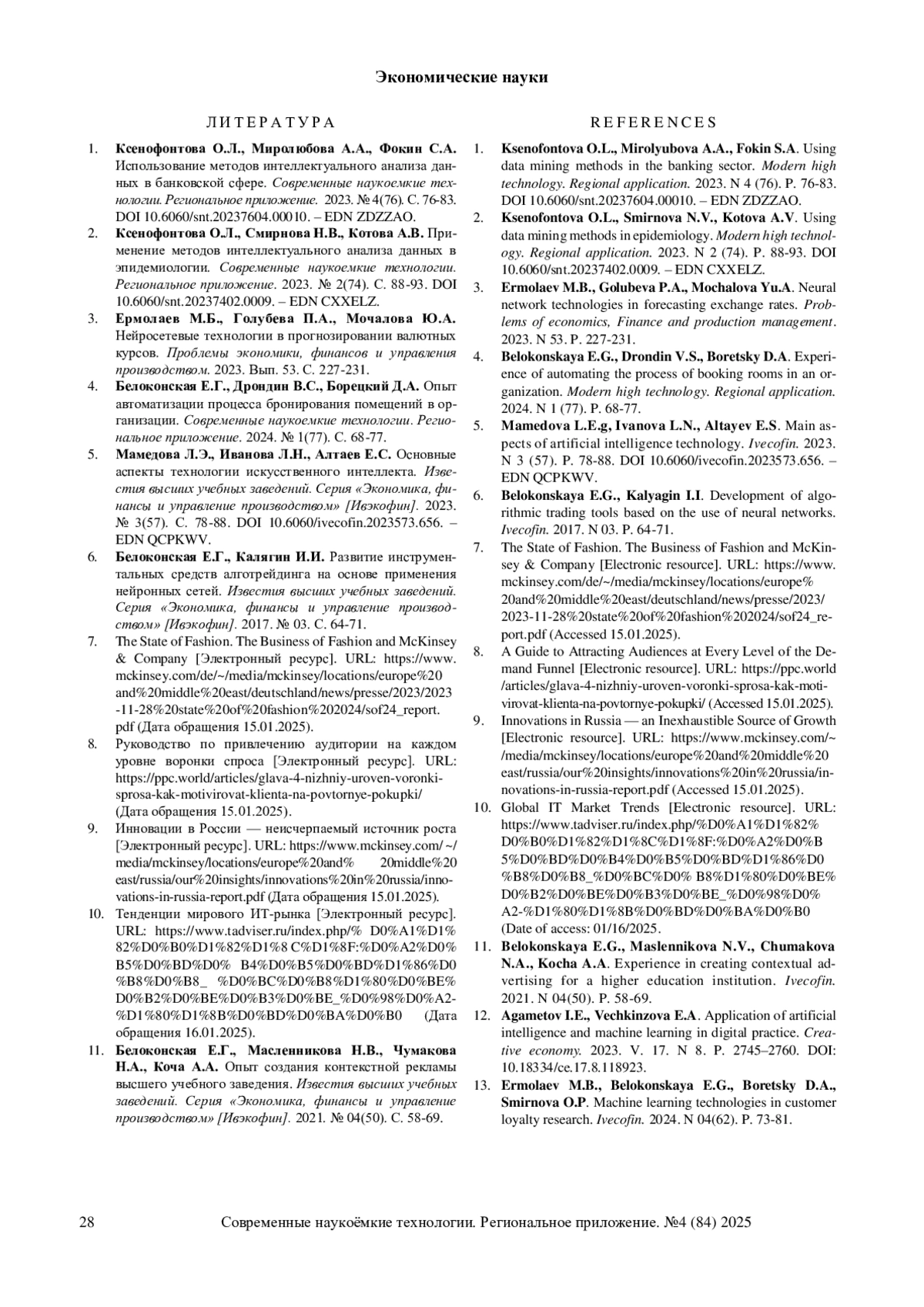 1. Ксенофонтова О.Л., Миролюбова А.А., Фокин С.А. Использование методов интеллектуального анализа данных в банковской сфере. Современные наукоемкие технологии. Региональное приложение. 2023. № 4(76). С. 76-83. DOI: 10.6060/snt.20237604.00010 EDN: ZDZZAO