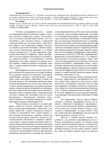 7. Николаева Е.Е., Берендеева А.Б., Рычихина Н.С. Социально-экономические характеристики малых городов разных типов (на примере Ивановской области). Современные наукоемкие технологии. Региональное приложение. 2023. № 4 (76). С. 40-54. DOI: 10.6060/snt.20237604.0006 EDN: KAQUID
