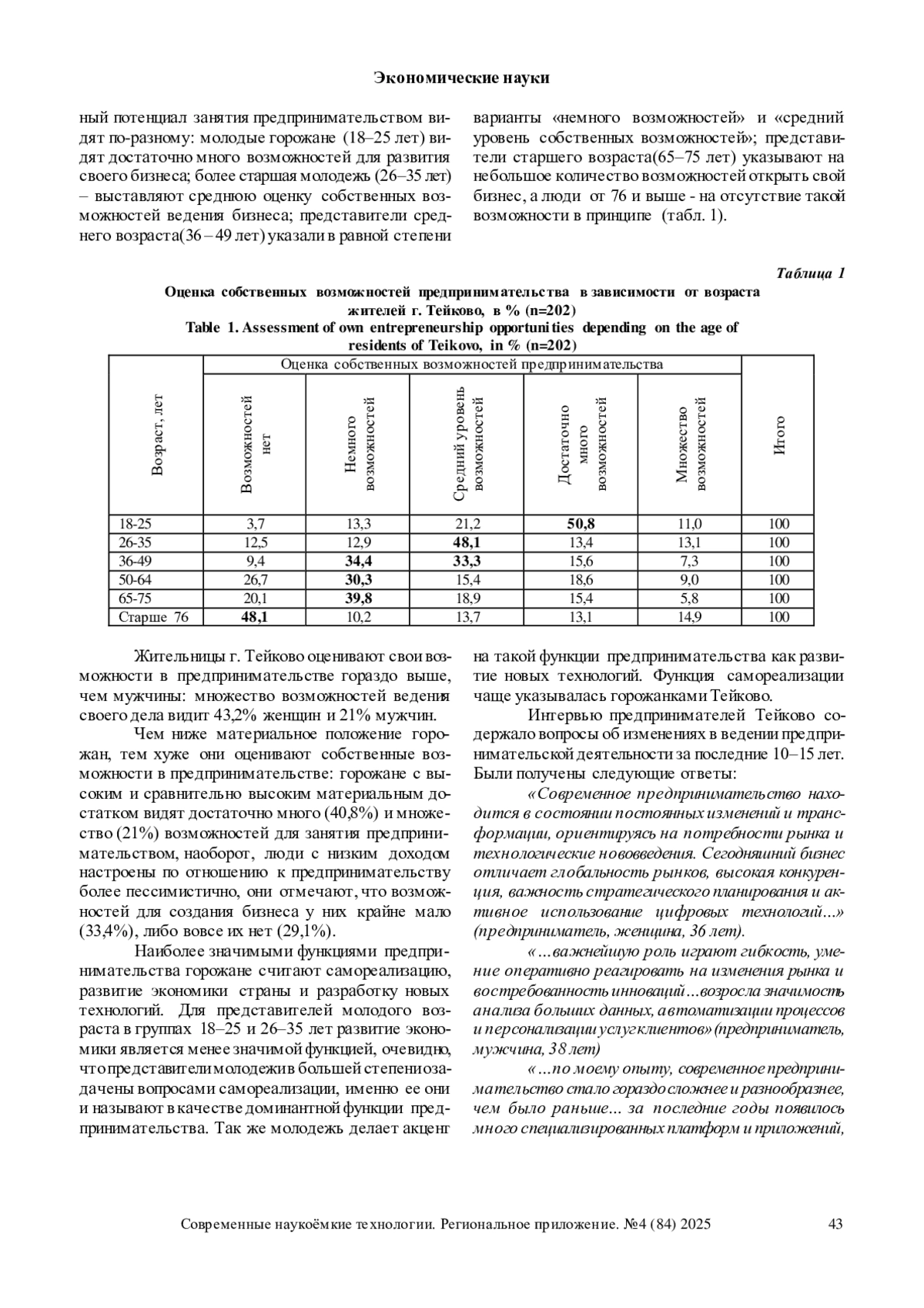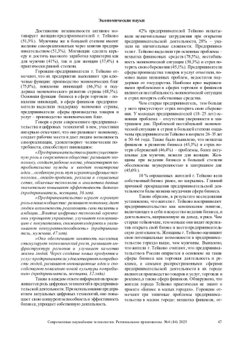 Статья посвящена анализу социально-экономических характеристик предпринимательской деятельности в условиях современного малого города. Приводятся данные комплексного социологического исследования, включающего анкетирование населения г. Тейково и интервью предпринимателей города. Делается вывод о понимании сути предпринимательства и оценках перспектив открытия собственного дела жителями города. Названы самые распространенные сферы предпринимательской деятельности в городе. Обнаружено, что жители города Тейково практически не знают о проекте «Бизнес в малых городах». Выявлены три главные типичные проблемы предпринимательства в малом городе с точки зрения его жителей: нехватка финансов, отсутствие уверенности в завтрашнем дне, недостаток цифровых технологий. Составлен социально-демографический портрет предпринимателя в г. Тейково. Выявлены цели ведения бизнеса, установлены ключевые функции и обозначена роль современного предпринимательства, с точки зрения действующих предпринимателей г. Тейково. Сделан вывод об основных проблемах, которые, по мнению предпринимателей, затрудняют ведение бизнеса в малом городе.