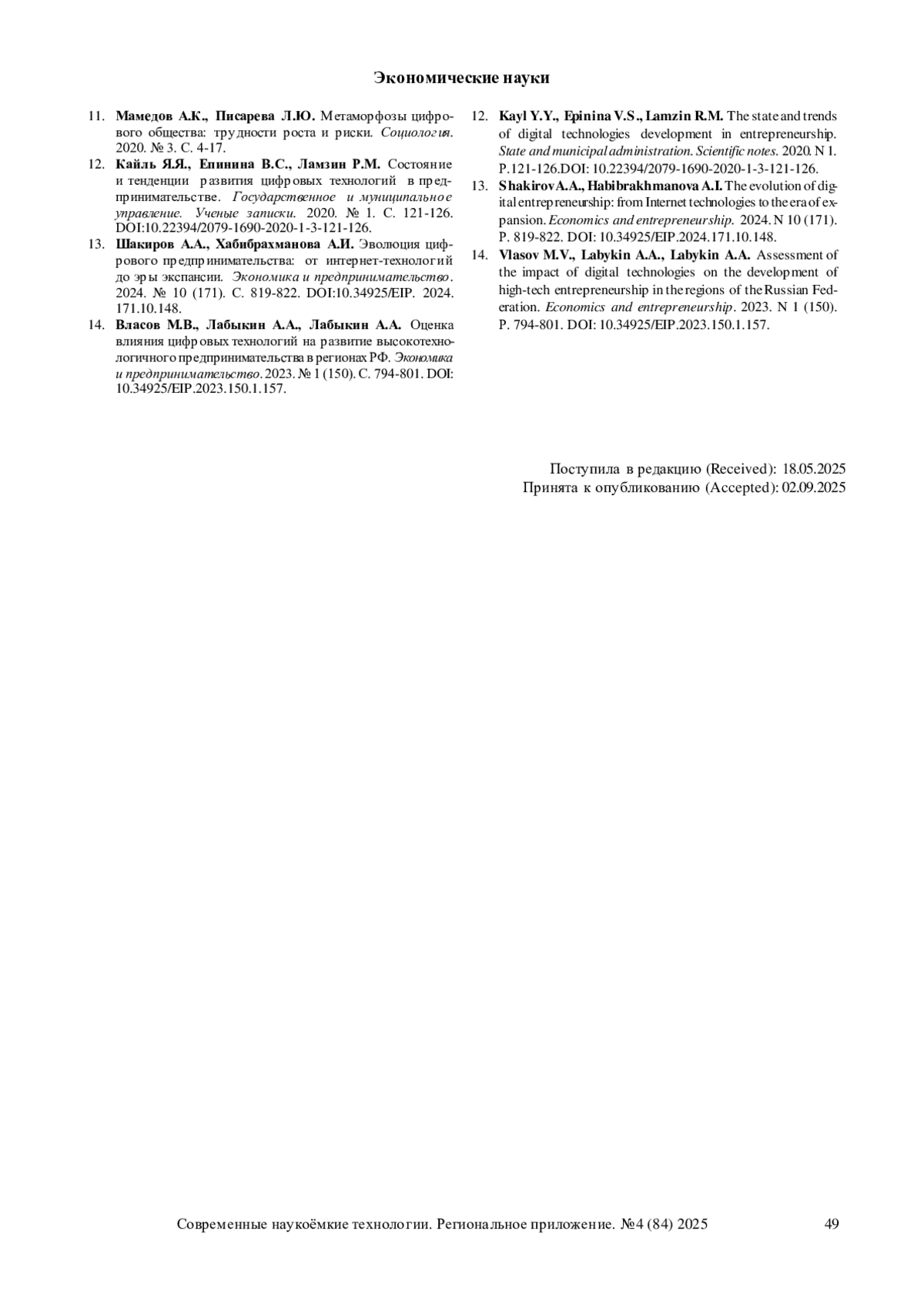 12. Кайль Я.Я., Епинина В.С., Ламзин Р.М. Состояние и тенденции развития цифровых технологий в предпринимательстве. Государственное и муниципальное управление. Ученые записки. 2020. № 1. С. 121-126. DOI: 10.22394/2079-1690-2020-1-3-121-126