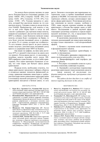 1. Бурса И.А., Сергиенко Е.А., Рукинова В.В. Криптовалюты и блокчейн: новые горизонты для инвестиций. Региональная и отраслевая экономика. 2025. №1. С. 182-187. DOI: 10.47576/2949-1916.2025.1.1.023 EDN: KWCOVB