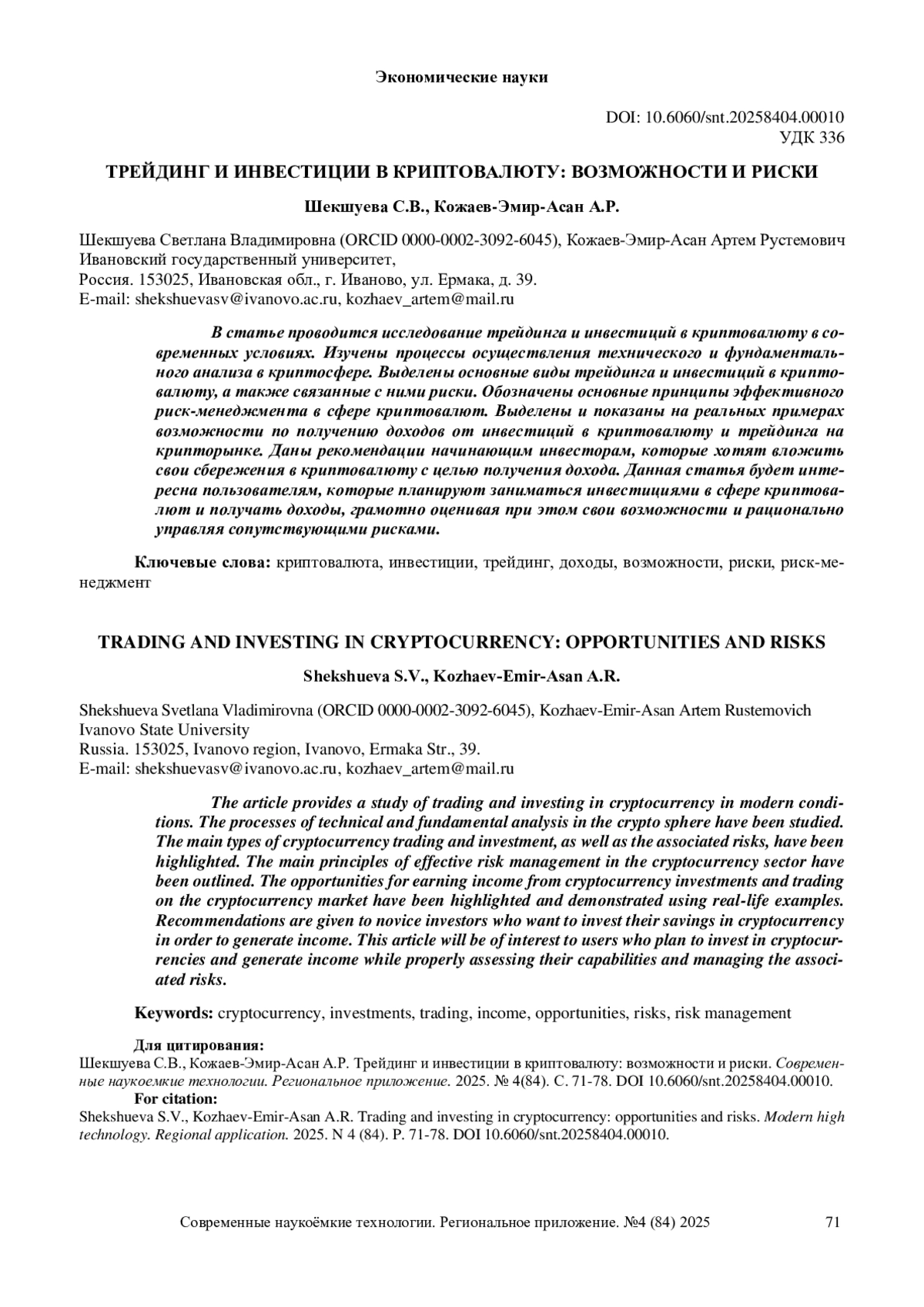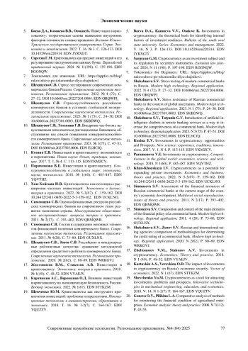 3. Шекшуева С.В., Кожаев-Эмир-Асан А.Р. Листинг криптовалют в современном мире: возможности получения доходов. Современные наукоемкие технологии. Региональное приложение. 2024. № 4 (80). С. 71-77. 10.6060/snt.20248004.0009. EDN. DOI: 10.6060/snt.20248004.0009.EDNEYTZGY EDN: EYTZGY