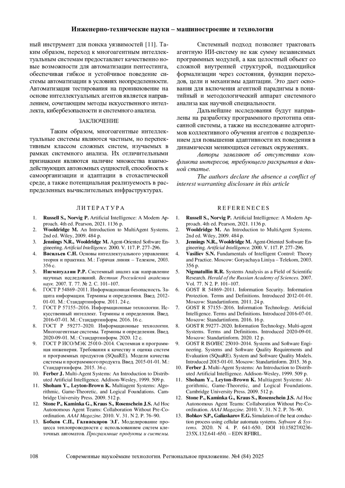 14. Bobkov S.P., Astrakhantseva I.A. The use of multi-agent systems for modeling technological processes. Journal of Physics: Conference Series: 2, Moscow, 01 июля 2021 года. Moscow, 2021. P. 012002. DOI: 10.1088/1742-6596/2001/1/012002 EDN: ZXPPKV