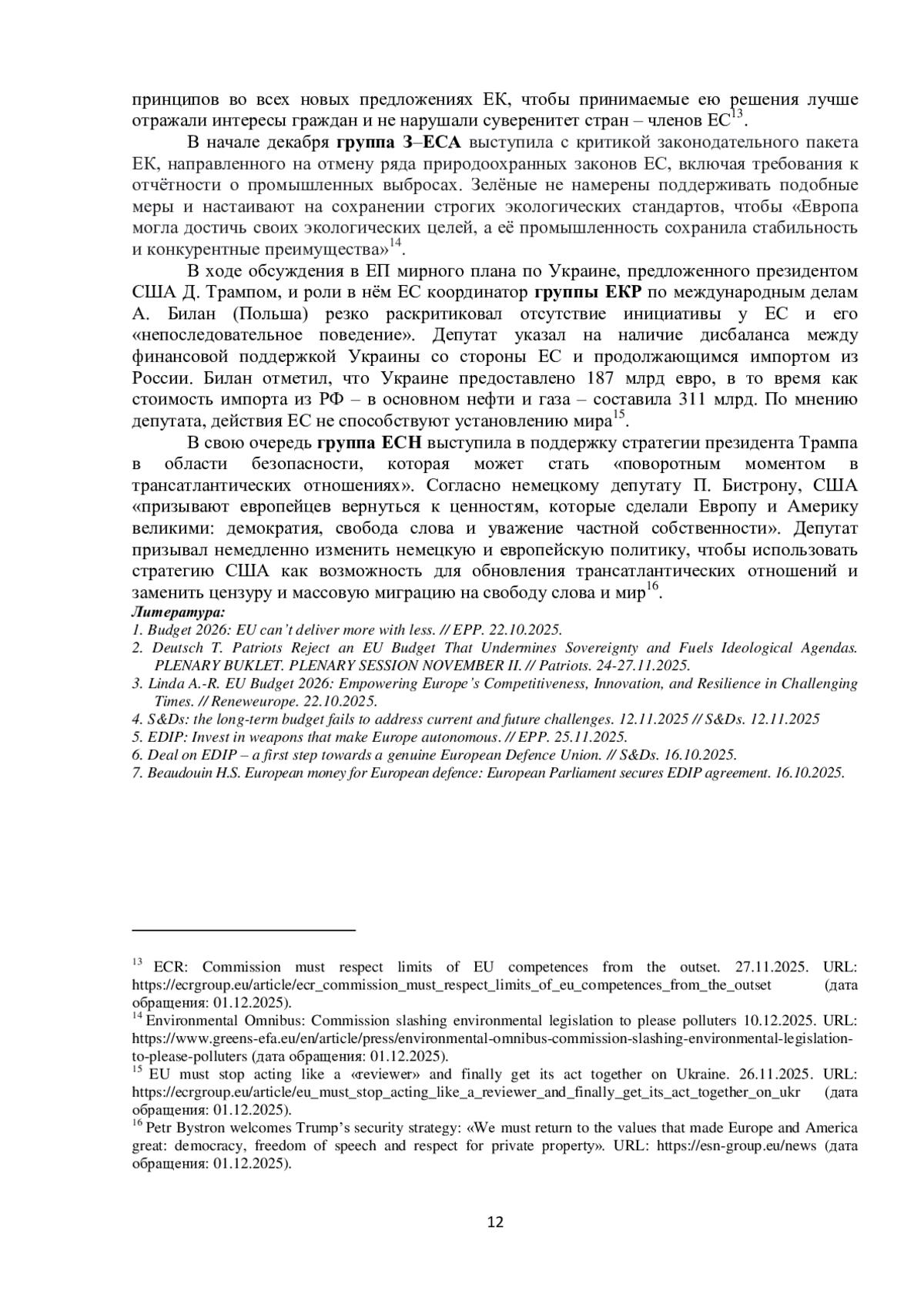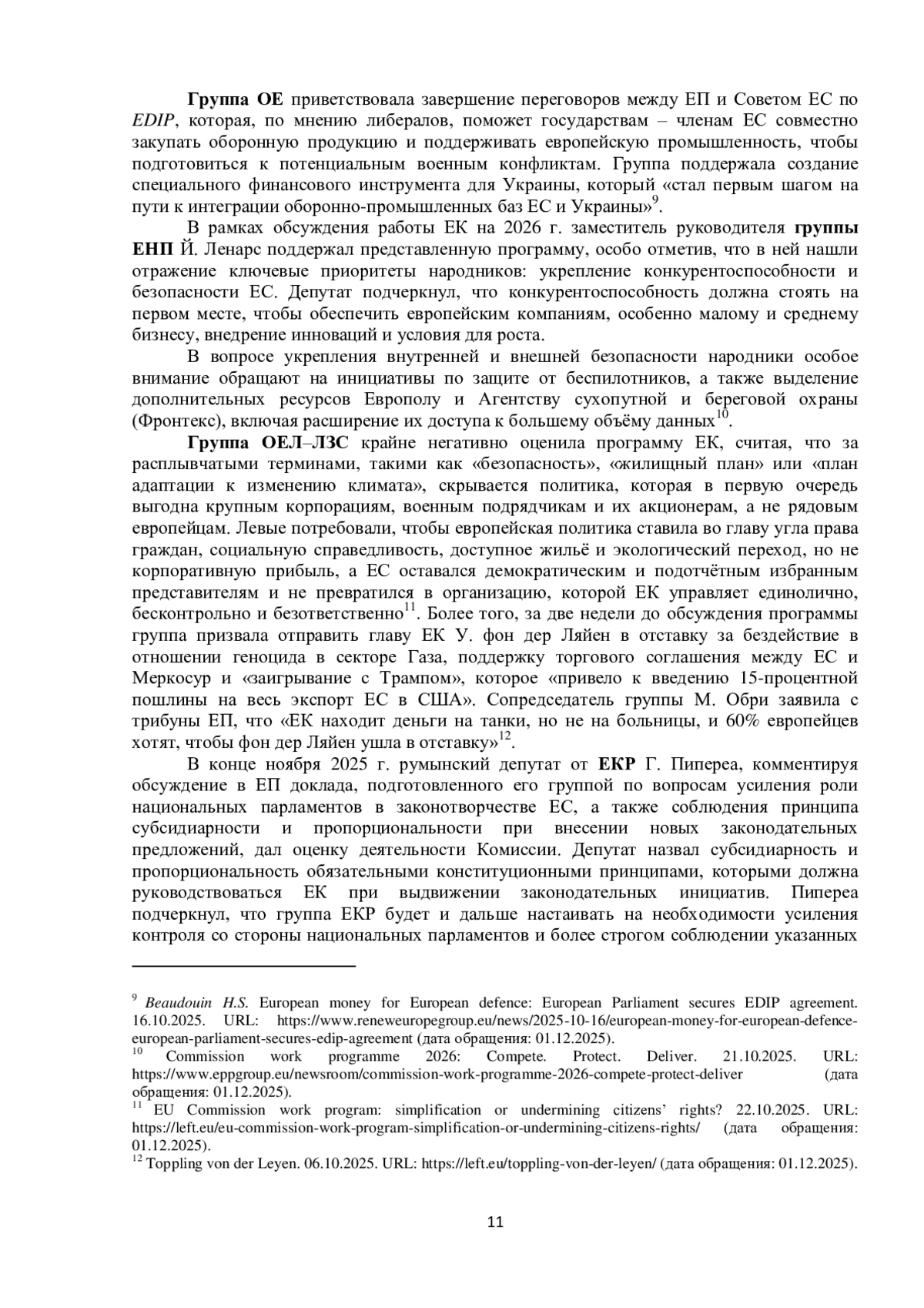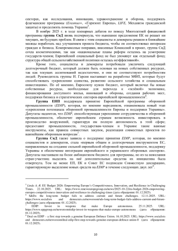 В сентябре – ноябре 2025 г. ведущие группы Европарламента – Европейская народная партия (ЕНП), Социалисты и демократы (СиД), Обновим Европу (ОЕ), Зелёные – Европейский свободный альянс (З–ЕСА), Патриоты за Европу (ПзЕ), Европейские консерваторы и реформисты (ЕКР), Объединённые европейские левые – Левые/зелёные Севера (ОЕЛ–ЛЗС) и Европа суверенных наций (ЕСН) – сконцентрировались на следующих темах: бюджет ЕС на 2026 г. и Многолетняя финансовая программа (MФП) на 2028‒2034 гг.; укрепление европейского Оборонного союза; оценка деятельности Еврокомиссии и её председателя; перспективы развития отношений между ЕС и Украиной и др