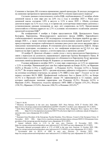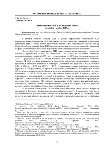 В течение осенних месяцев 2025 г. усилия европейских чиновников были преимущественно направлены на согласование спорных аспектов, связанных с введением цифрового евро, а также анализ применения правил Пакта стабильности и роста (ПСР). Европейский центральный банк (ЕЦБ) сохранил ключевые процентные ставки без изменений на фоне стабилизации показателей инфляции и оживления европейской экономики.