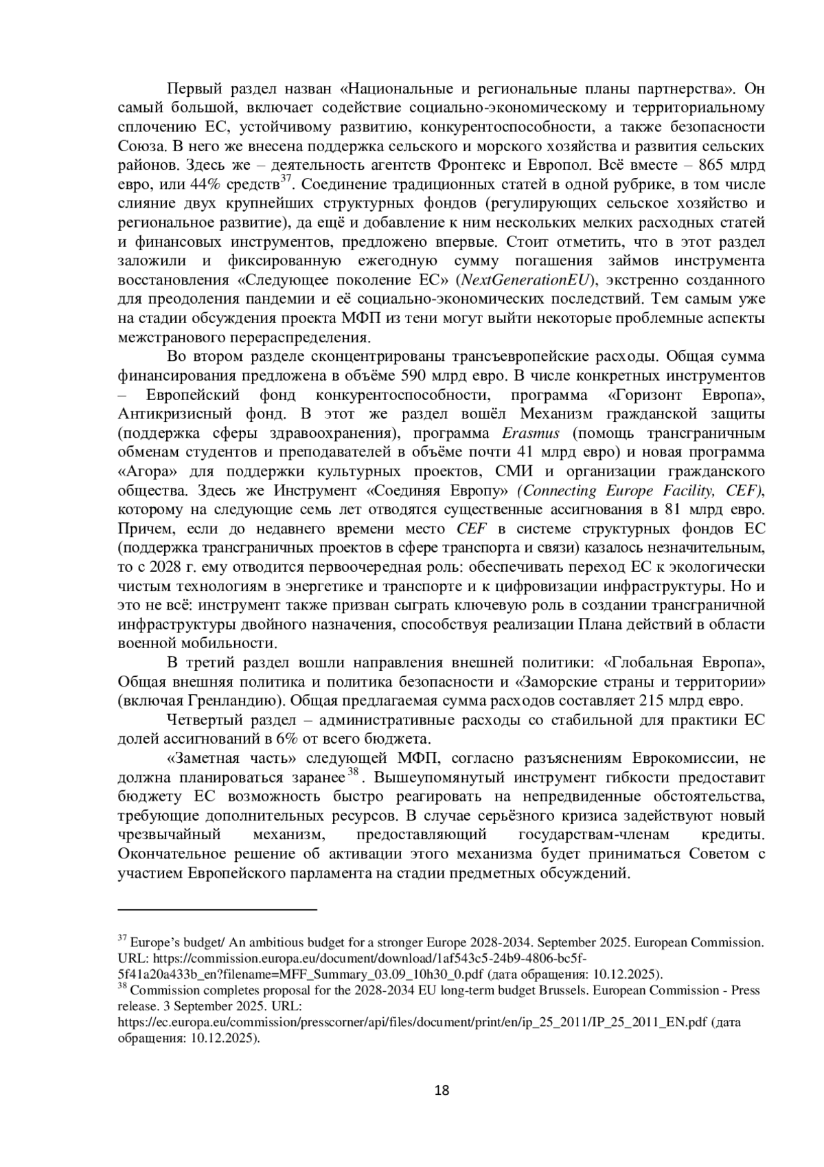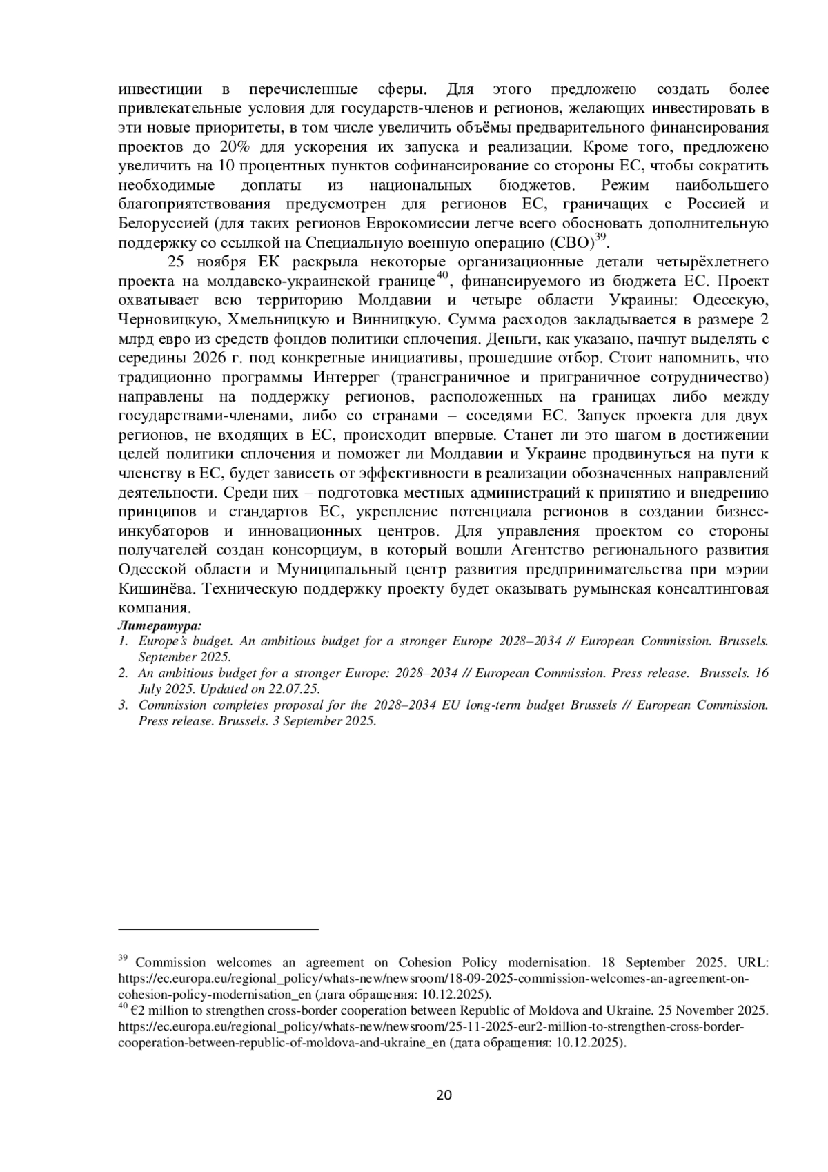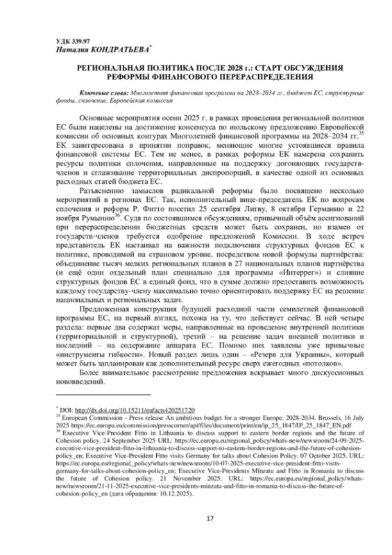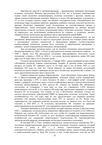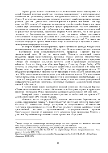 Основные мероприятия осени 2025 г. в рамках проведения региональной политики ЕС были нацелены на достижение консенсуса по июльскому предложению Европейской комиссии об основных контурах Многолетней финансовой программы на 2028–2034 гг.35 ЕК заинтересована в принятии поправок, меняющие многие устоявшиеся правила финансовой системы ЕС. Тем не менее, в рамках реформы ЕК намерена сохранить ресурсы политики сплочения, направленные на поддержку догоняющих государствчленов и сглаживание территориальных диспропорций, в качестве одной из основных расходных статей бюджета ЕС