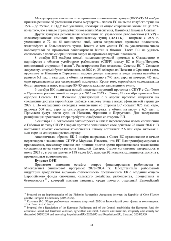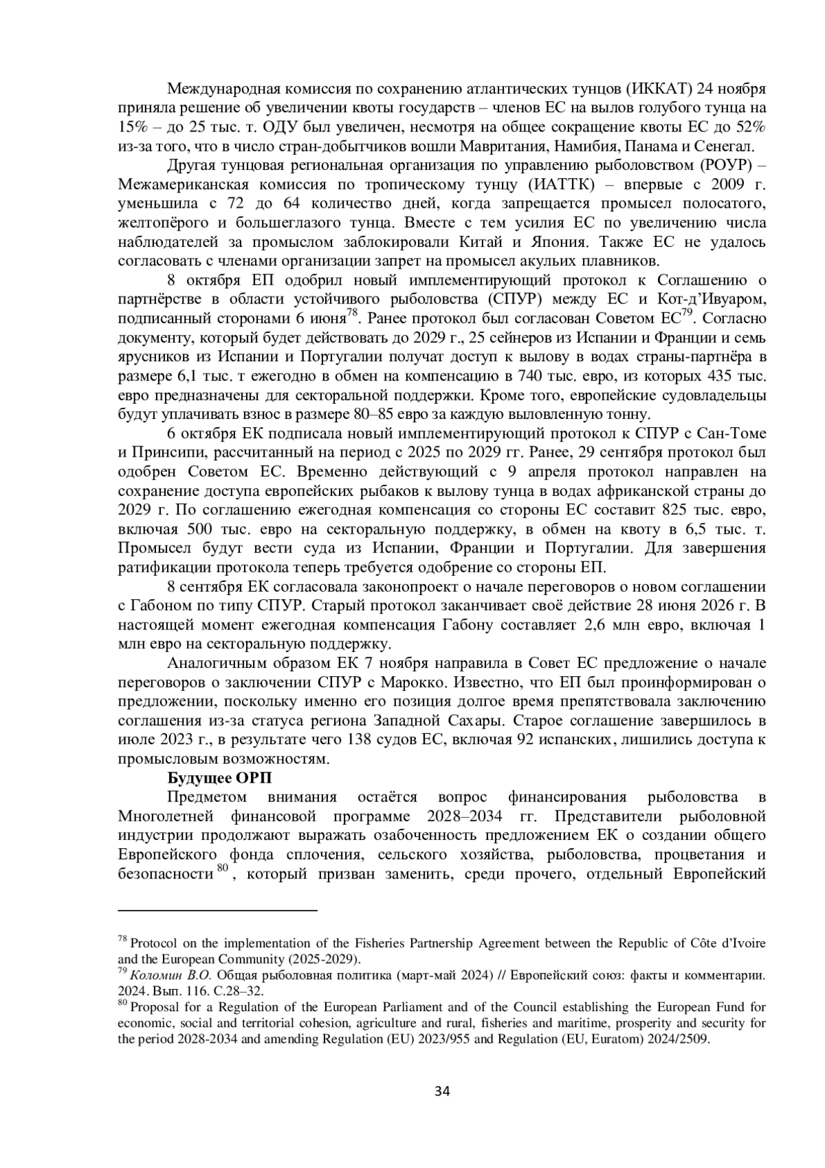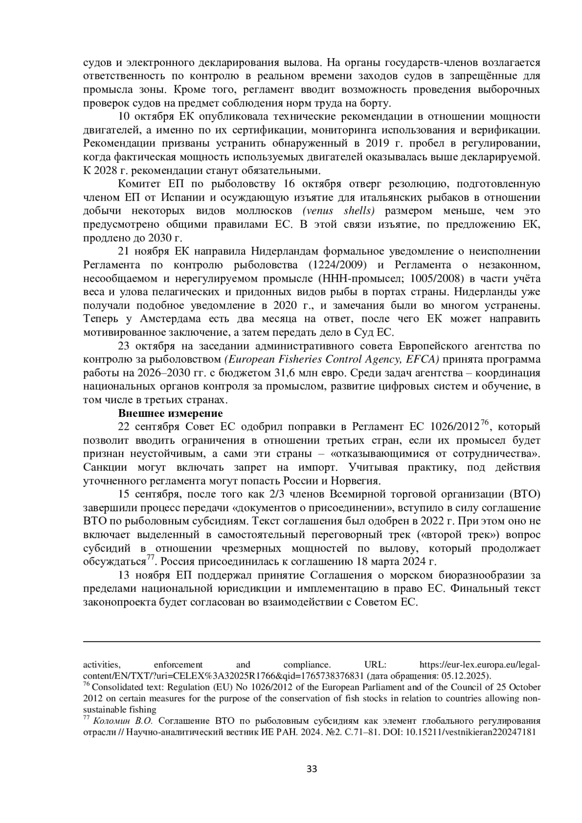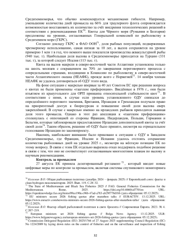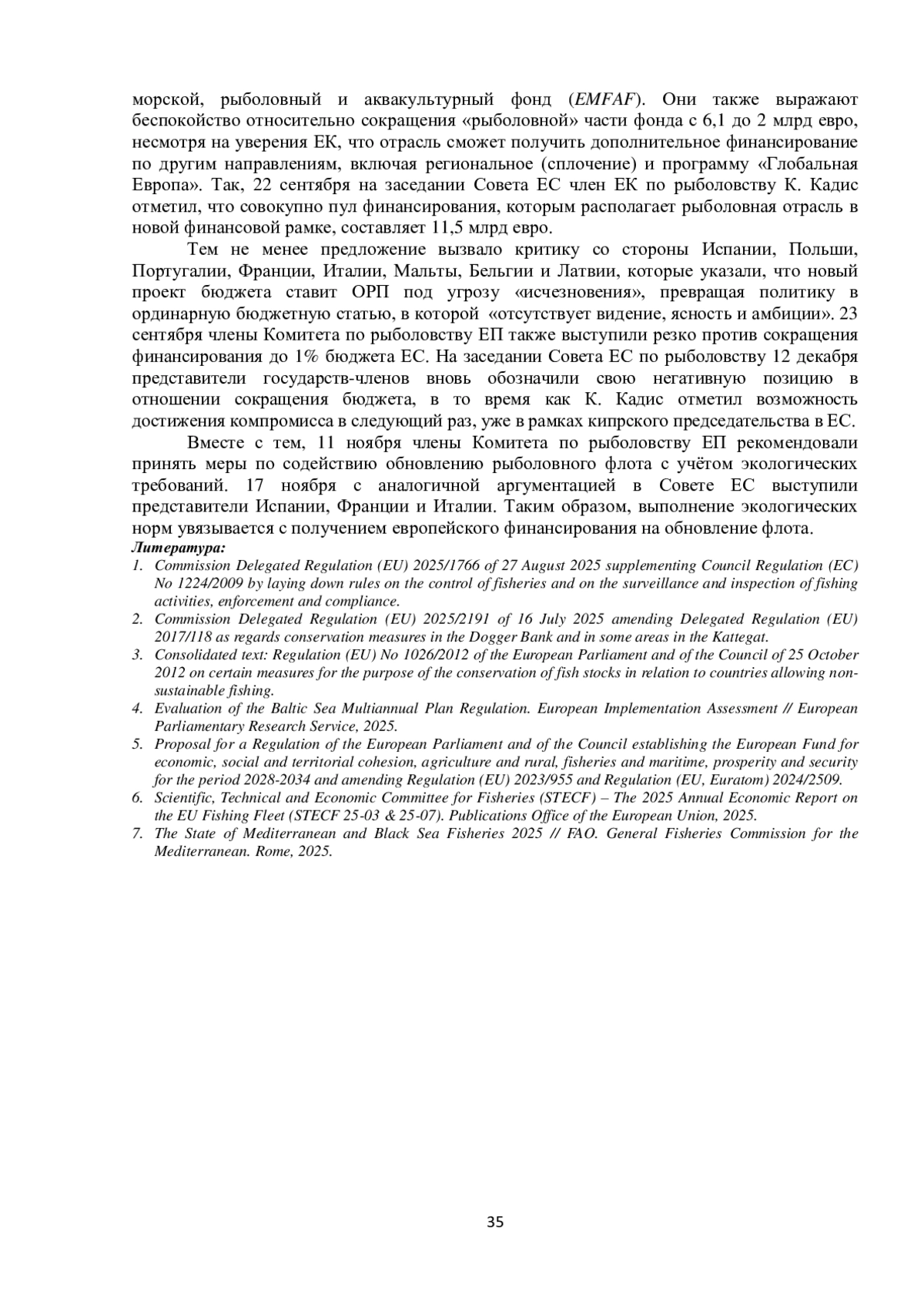 Конец года знаменуется согласованием квот на вылов в 2026 г. К этому процессу традиционно приковано внимание всех заинтересованных сторон. Наиболее сложные обсуждения проходят по вопросу рыболовных возможностей в Балтийском море. Как показало исследование68, проведённое по заказу Европарламента, четыре из семи видов рыбы, подпадающих под действие многолетнего плана по вылову в Балтийском море, попрежнему находятся под угрозой. Прежде всего это треска и сельдь. Характерно, что причиной указано систематическое установление Советом ЕС общих допустимых уловов на уровнях выше научно рекомендованных. С этой позицией солидарна и Еврокомиссия, которая также признаёт тот факт, что задачи общей рыболовной политики (ОРП) в Балтийском море пока не достигнуты и отмечает, что проблема заключается не в следовании установленным квотам, а в том, что они устанавливаются сверх предлагаемых ЕК значений. При этом полный запрет промысла, предложение о котором поступило со стороны представителей фракций «Зелёные» и Прогрессивный альянс социалистов и демократов ЕП, в настоящий момент не рассматривается