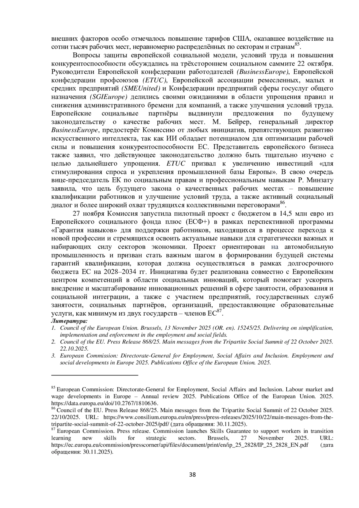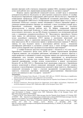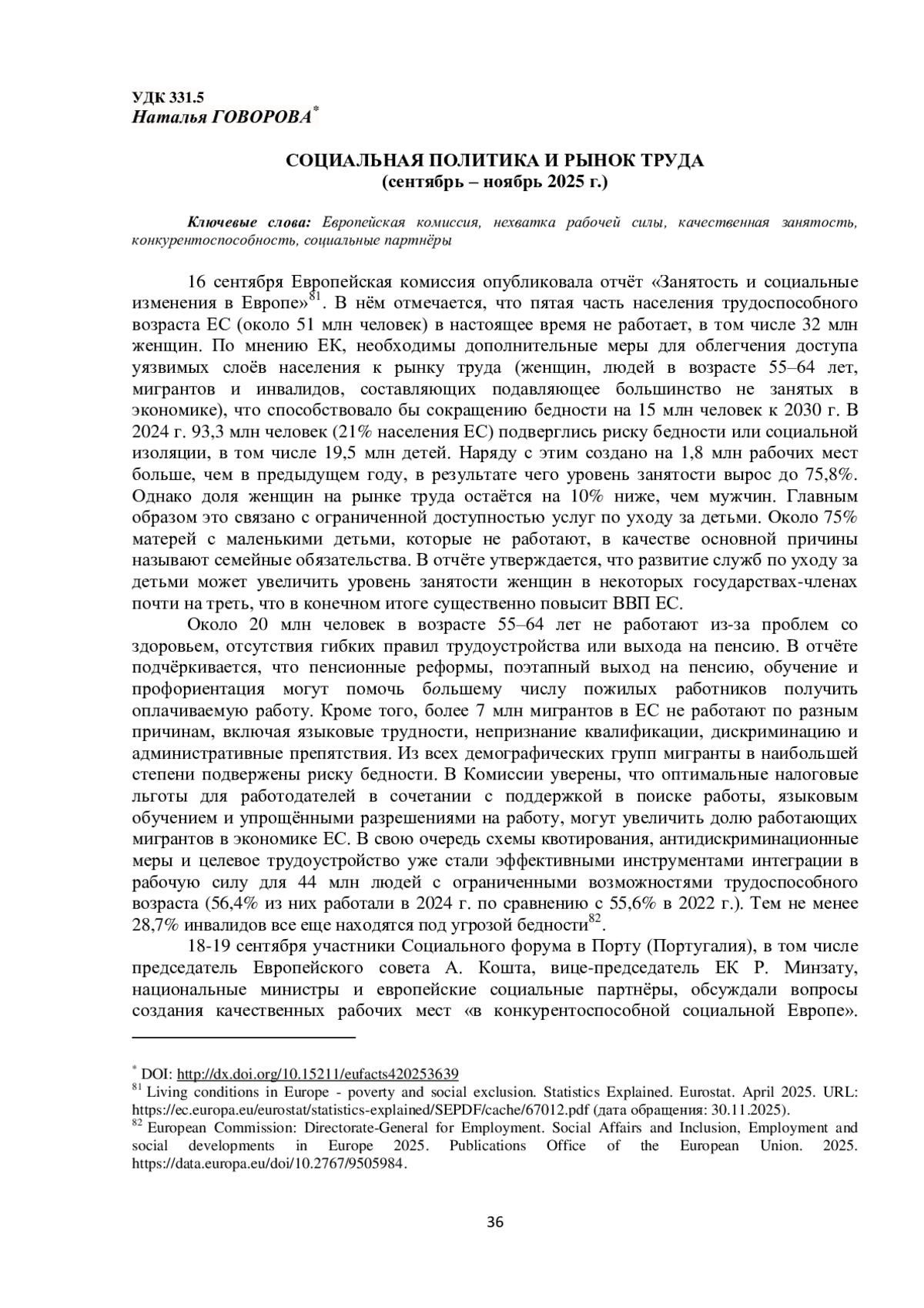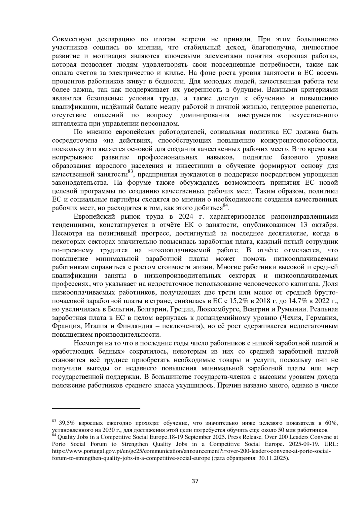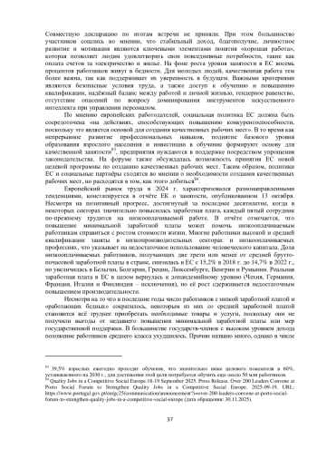 16 сентября Европейская комиссия опубликовала отчёт «Занятость и социальные изменения в Европе»81. В нём отмечается, что пятая часть населения трудоспособного возраста ЕС (около 51 млн человек) в настоящее время не работает, в том числе 32 млн женщин. По мнению ЕК, необходимы дополнительные меры для облегчения доступа уязвимых слоёв населения к рынку труда (женщин, людей в возрасте 55‒64 лет, мигрантов и инвалидов, составляющих подавляющее большинство не занятых в экономике), что способствовало бы сокращению бедности на 15 млн человек к 2030 г. В 2024 г. 93,3 млн человек (21% населения ЕС) подверглись риску бедности или социальной изоляции, в том числе 19,5 млн детей. Наряду с этим создано на 1,8 млн рабочих мест больше, чем в предыдущем году, в результате чего уровень занятости вырос до 75,8%. Однако доля женщин на рынке труда остаётся на 10% ниже, чем мужчин. Главным образом это связано с ограниченной доступностью услуг по уходу за детьми. Около 75% матерей с маленькими детьми, которые не работают, в качестве основной причины называют семейные обязательства. В отчёте утверждается, что развитие служб по уходу за детьми может увеличить уровень занятости женщин в некоторых государствах-членах почти на треть, что в конечном итоге существенно повысит ВВП ЕС