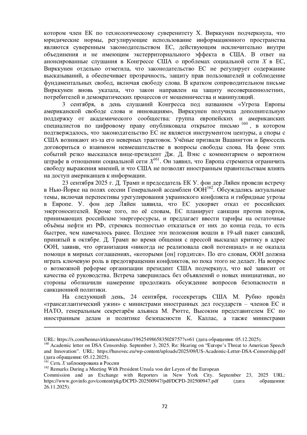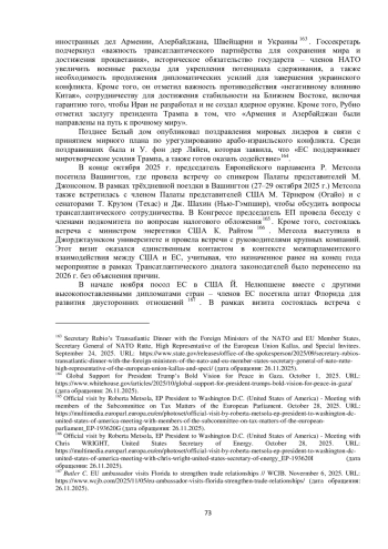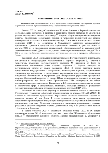 Осенью 2025 г. между Соединёнными Штатами Америки и Европейским союзом состоялась серия контактов. В сентябре в Вашингтоне прошла очередная 13-ая встреча в рамках двустороннего диалога по космосу158. Стороны обсудили широкий круг вопросов, включая безопасность космических полётов и устранение препятствий для ведения коммерческой деятельности в космическом секторе. В контексте коммерческого космоса делегации США и ЕС обратились к Совместному заявлению, согласованному президентом Трампом и председателем Европейской комиссии У. фон дер Ляйен 21 августа 2025 г., о продвижении справедливой, сбалансированной и взаимовыгодной торговли и инвестиций. Диалог также укрепил сложившуюся координацию между США и ЕС в сферах глобальных навигационных спутниковых систем и программ наблюдения Земли.