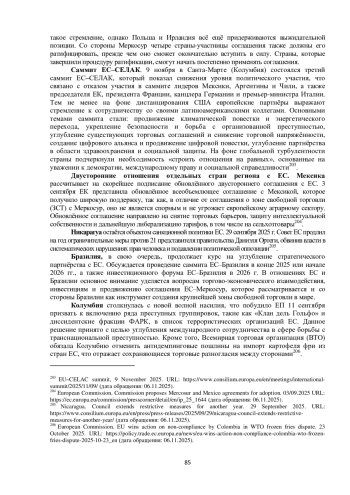 Торговое соглашение ЕС–Меркосур. 8 октября Европейская комиссия (ЕК) представила Совету ЕС обновлённый текст торгового соглашения с Меркосур, включающий новую законодательную инициативу («защитную оговорку»), направленную на контроль импорта и защиту рынков европейских фермеров. Такой шаг рискует быть негативно воспринято странами Меркосур, так как выходит за рамки уже заключённого соглашения201. Предложение ЕК заключается во введении нового механизма защитных мер для 23 особо чувствительных сельскохозяйственных товаров (включая говядину, птицу, яйца, сахар, а также биодизель и этанол) в рамках интеррегионального соглашения ЕС–Меркосур. Этот шаг стал прямым ответом на обеспокоенность стран ‒ членов ЕС, опасающихся, что существующие защитные процедуры не смогут эффективно оградить их рынки от резкого увеличения импорта из стран Меркосур202. Ряд ведущих европейских союзов производителей, включая Copa-Cogeca (сельскохозяйственные организации и кооперативы ЕС), CEFS (европейские производители сахара), AVEC (европейские птицеводы) и CIBE (производители свёклы), выступили против таких поправок, так как считают, что предложение, содержащее двусторонний защитный механизм, не решает фундаментальных проблем