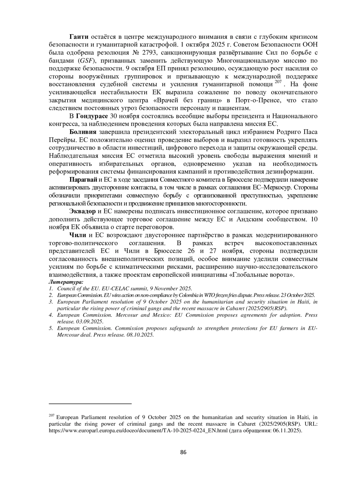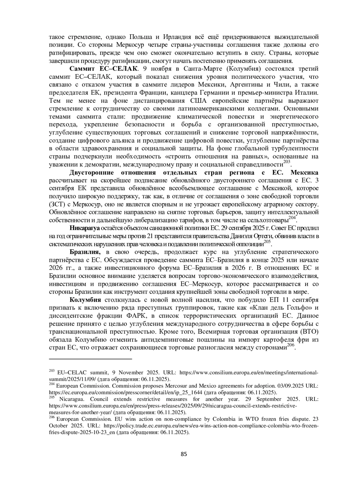 Европейский союз проводит интенсивную работу по стратегическому сближению с Латинской Америкой и странами Карибского бассейна (ЛАК), стремясь укрепить свои позиции в условиях глобальной «стратегической конкуренции». Ключевыми тенденциями и событиями осени 2025 г. можно назвать следующие: постепенное продвижение затянувшегося процесса ратификации интеррегионального соглашения ЕС–Меркосур; проведение саммита ЕС–СЕЛАК; углубление партнёрства стран, помимо торговли, в сферах безопасности, цифровизации и искусственного интеллекта, здравоохранения, климата.