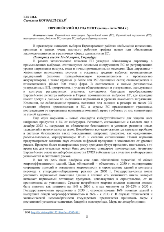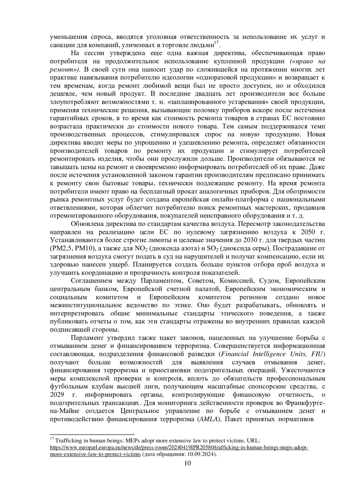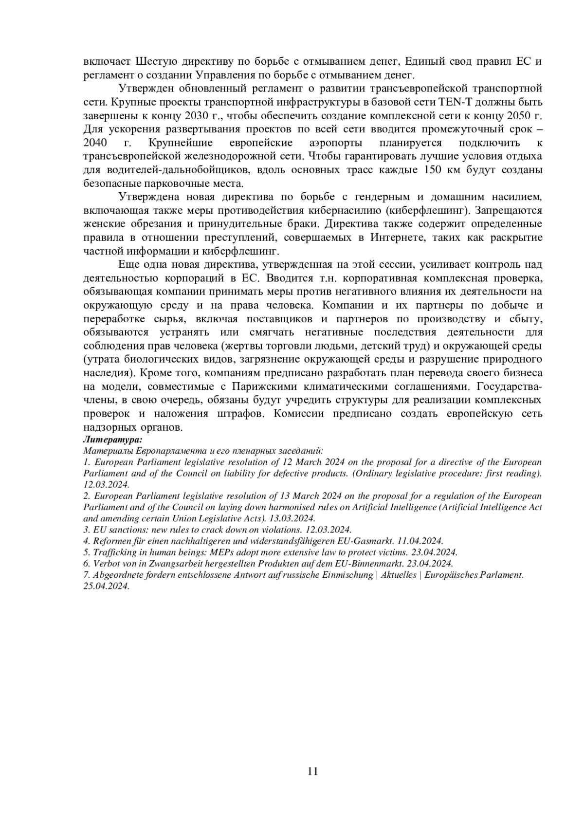 6–9 июня 2024 г. в 27 странах – членах Евросоюза прошли очередные 10-е выборы 720 депутатов (ДЕП) Европарламента (ЕП). По их итогам произошли определенные изменения в партийно-политической структуре ЕП: вместо семи парламентских групп образованы восемь. Сохранились группы: крупнейшая Европейская народная партия (ЕНП), Социалисты и демократы (СиД), «Обновим Европу» (ОЕ), Зеленые – Европейский свободный альянс (З–ЕСА), Европейские консерваторы и реформисты (ЕКР) и Объединенные европейские левые – Левые зеленые Севера (ОЕ–ЛЗС). На месте радикально евроскептической группы Идентичность и демократия (ИиД) возникли две новые: умеренно евроскептическая «Патриоты за Европу», основу которой составили ДЕП от партий Национальное объединение (Франция), Фидес (Венгрия), Лига (Италия) и др., включающая 88 человек (третья по численности после ЕНП и СиД), и радикально евроскептическая «Европа суверенных наций», большинство в которой составляют депутаты от партии Альтернатива для Германии, насчитывающая 25 ДЕП (самая малочисленная)