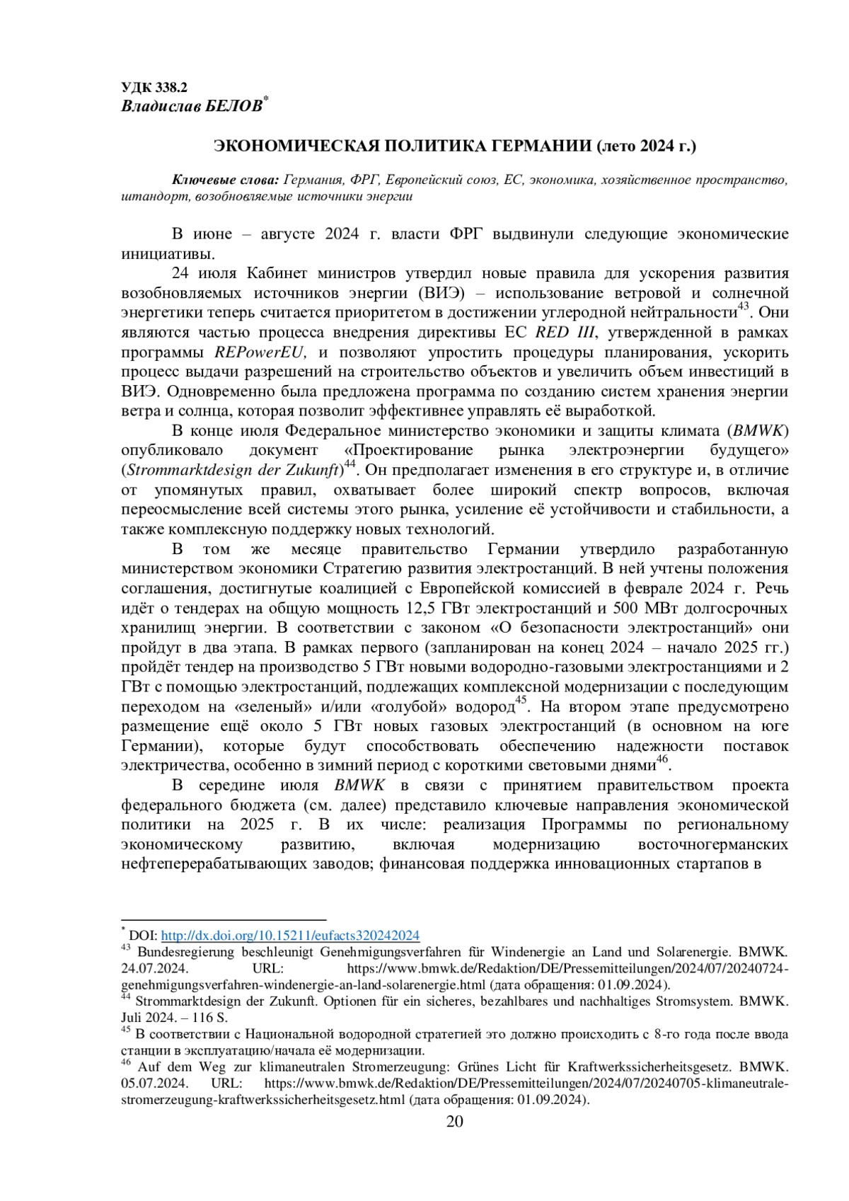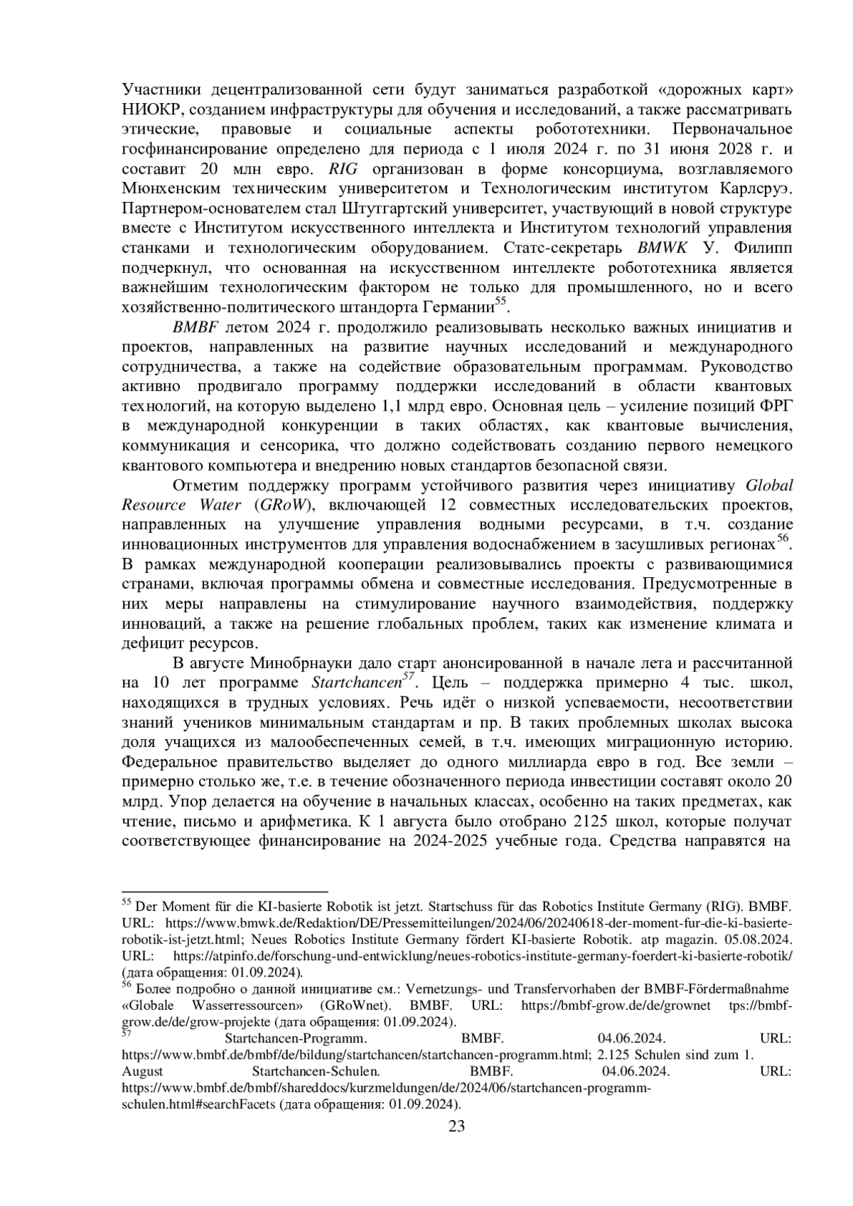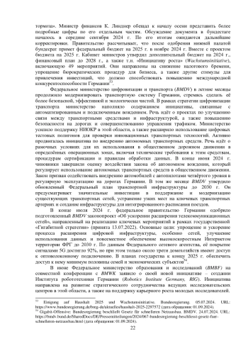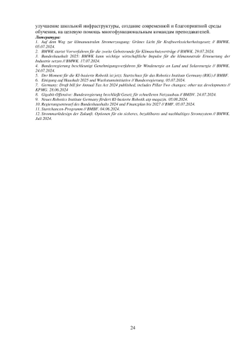 В июне – августе 2024 г. власти ФРГ выдвинули следующие экономические инициативы. 24 июля Кабинет министров утвердил новые правила для ускорения развития возобновляемых источников энергии (ВИЭ) – использование ветровой и солнечной энергетики теперь считается приоритетом в достижении углеродной нейтральности43. Они являются частью процесса внедрения директивы ЕС RED III, утвержденной в рамках программы REPowerEU, и позволяют упростить процедуры планирования, ускорить процесс выдачи разрешений на строительство объектов и увеличить объем инвестиций в ВИЭ. Одновременно была предложена программа по созданию систем хранения энергии ветра и солнца, которая позволит эффективнее управлять её выработкой