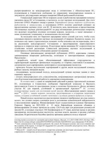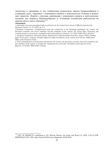20 июня Европейское исполнительное агентство по климату, инфраструктуре и окружающей среде (CINEA)103 опубликовало ориентиры будущей европейской арктической политики в отношении сохранения биоресурсов региона – «Стратегическая научная поддержка рыболовства в открытом море в центральной части Северного Ледовитого океана»104. Цель данной публикации – представить обзор работ, выполненных Европейским консорциумом рыбохозяйственной инвентаризации (EFICA) в центральной части Северного Ледовитого океана в период с 2018 по 2023 гг. в поддержку вклада ЕС в Совместную программу научных исследований и мониторинга в центральной части Северного Ледовитого океана (JPSRM). Консорциум выполнил в общей сложности шесть проектов, финансируемых Европейским фондом морского судоходства, рыболовства и аквакультуры, 10-летний юбилей которого отмечается в этом году105. Каждый из проектов охватывал различные этапы: от определения потребностей в исследованиях и пробелов в данных до анализа результатов двух научных экспедиций