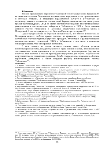 12. Узбекистан: в Ташкенте состоялось 20-е заседание Подкомитета при ЕС по правосудию, внутренним делам, правам человека и смежным вопросам // Представительство ЕС в Узбекистане. 24 июня 2024 г.