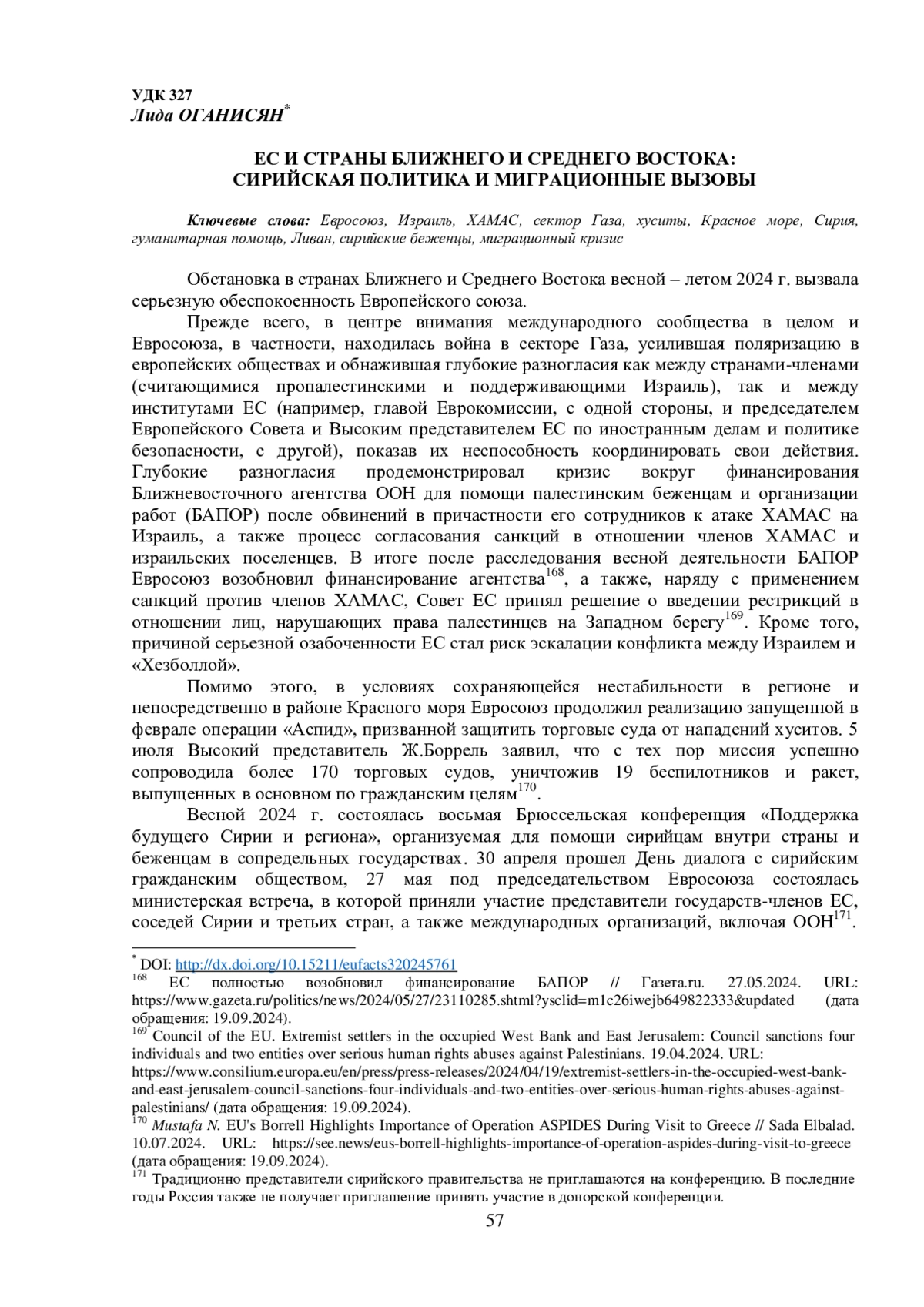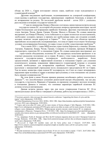 2. Оганисян Л.Д. Подход ЕСксмягчению воздействия санкций на гуманитарную помощь: сирийский кейс. Анализ и прогноз. // Журнал ИМЭМО РАН, 2024, N 2. - С. 13-28. EDN: NDUFCJ