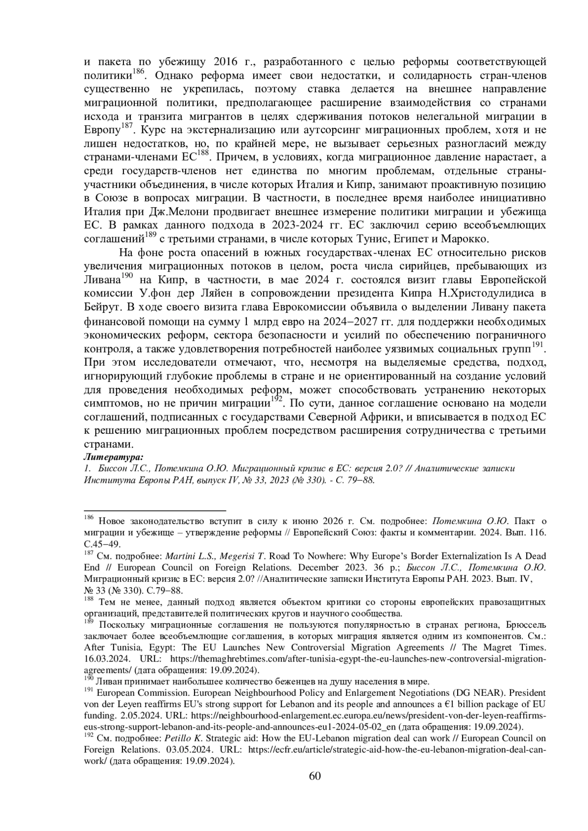 1. Биссон Л.С., Потемкина О.Ю. Миграционный кризис в ЕС: версия 2.0? // Аналитические записки Института Европы РАН, выпуск IV, № 33, 2023 (№ 330). - С. 79-88. EDN: EHFULQ