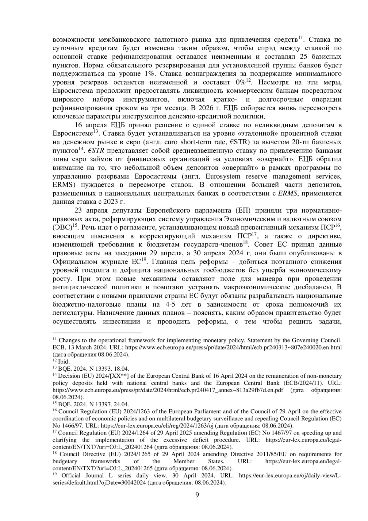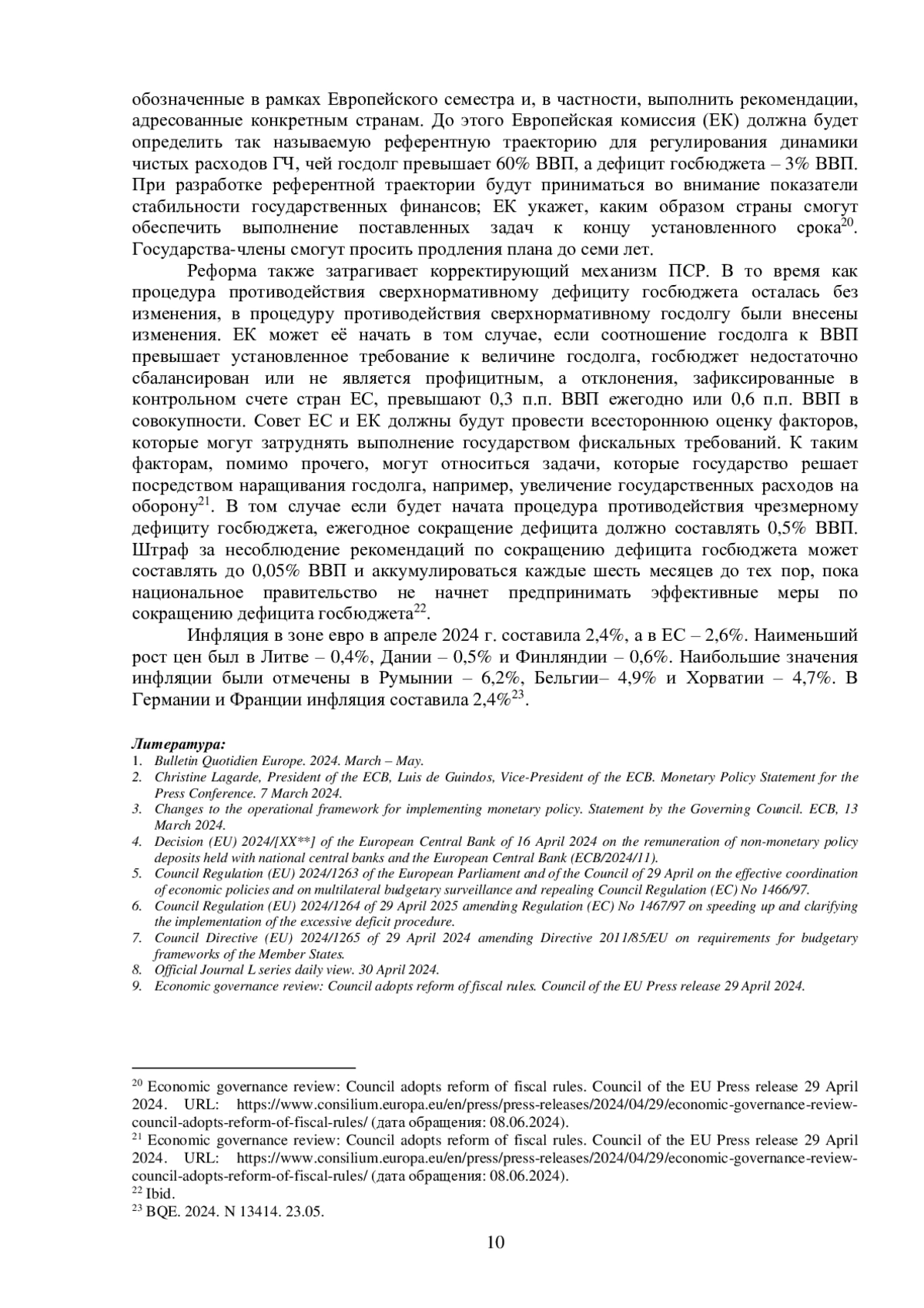 В апреле 2024 г. одобрены новые механизмы обеспечения фискальной дисциплины в государствах – членах Европейского союза. Два регламента и одна директива вносят существенные изменения в Пакт стабильности и роста (ПСР) и призваны, помимо прочего, содействовать привлечению инвестиций в цифровые и «зелёные» технологии, а также оборонный сектор. Европейский центральный банк (ЕЦБ) не повышал ключевые процентные ставки, но при этом и не обозначал предполагаемую траекторию и график их снижения