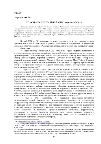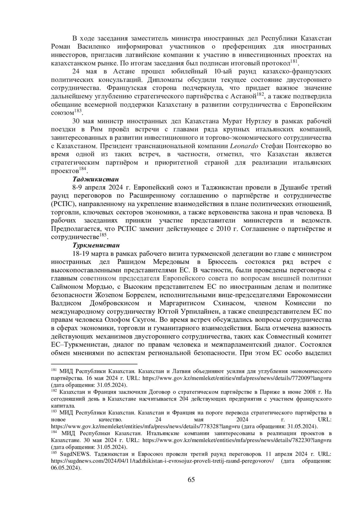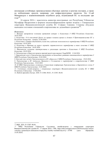 Весной 2024 г. ЕС продолжил активно укреплять связи со странами региона Центральной Азии, в том числе в рамках подготовки к подписанию и реализации договоров нового поколения – Расширенных соглашений о партнёрстве и сотрудничестве.