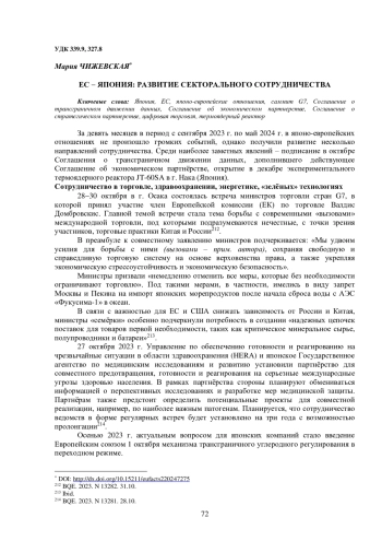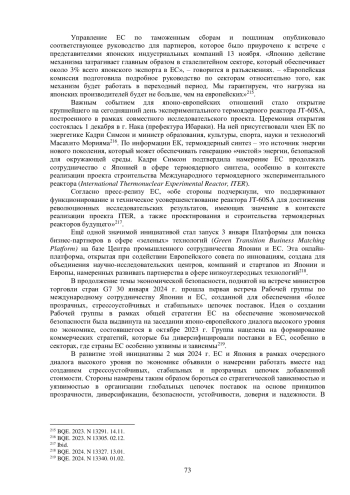 За девять месяцев в период с сентября 2023 г. по май 2024 г. в японо-европейских отношениях не произошло громких событий, однако получили развитие несколько направлений сотрудничества. Среди наиболее заметных явлений – подписание в октябре Соглашения о трансграничном движении данных, дополнившего действующее Соглашение об экономическом партнёрстве, открытие в декабре экспериментального термоядерного реактора JT-60SA в г. Нака (Япония)