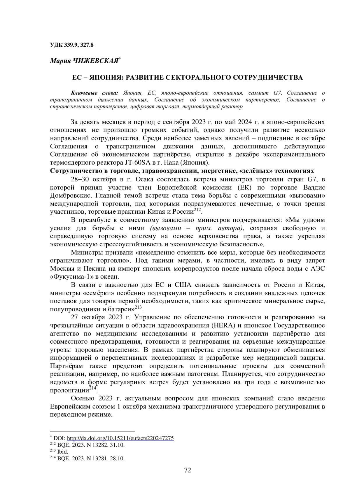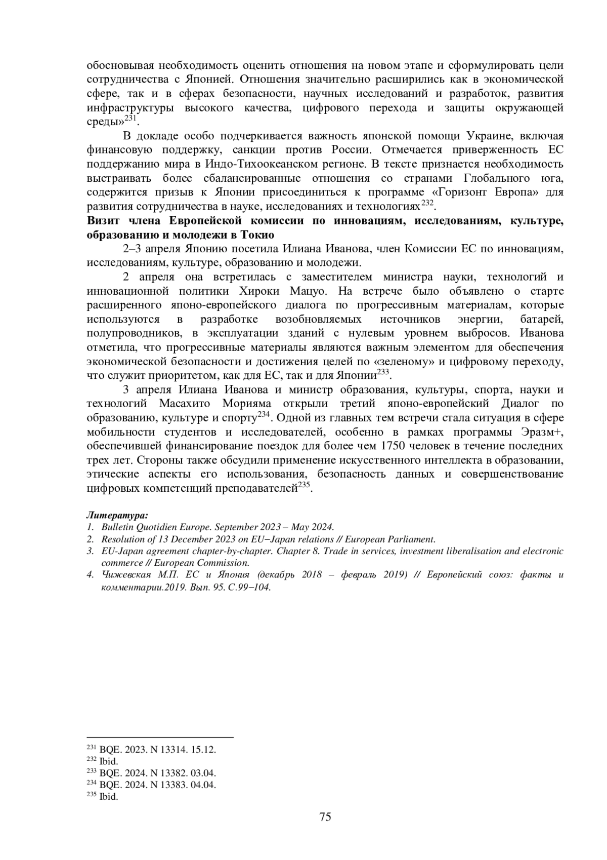 4. Чижевская М.П. ЕС и Япония (декабрь 2018 - февраль 2019) // Европейский союз: факты и комментарии.2019. Вып. 95. С.99-104. EDN: IOVKSZ