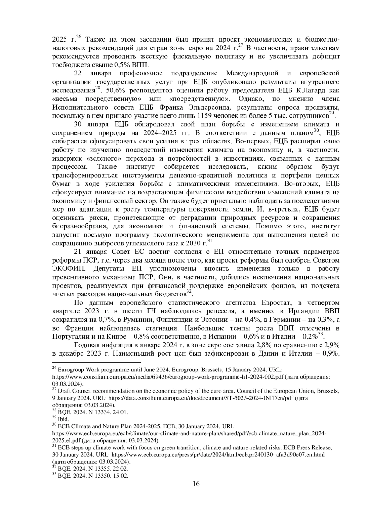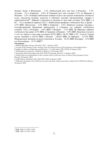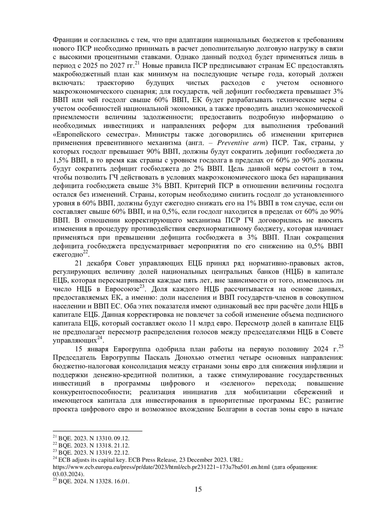 Важнейшим событием в Экономическом и валютном союзе в зимний период 2023– 2024 гг. стало согласование позиций в отношении точных параметров реформы Пакта стабильности и роста (ПСР) между Советом ЕС и Европейским парламентом (ЕП). Таким образом, новые требования по поддержанию фискальной дисциплины в государствахчленах зоны евро могут вступить в силу с начала 2025 г. Европейский центральный банк (ЕЦБ) приостановил повышение ключевых процентных ставок, но о перспективе их снижения денежный регулятор не сообщал