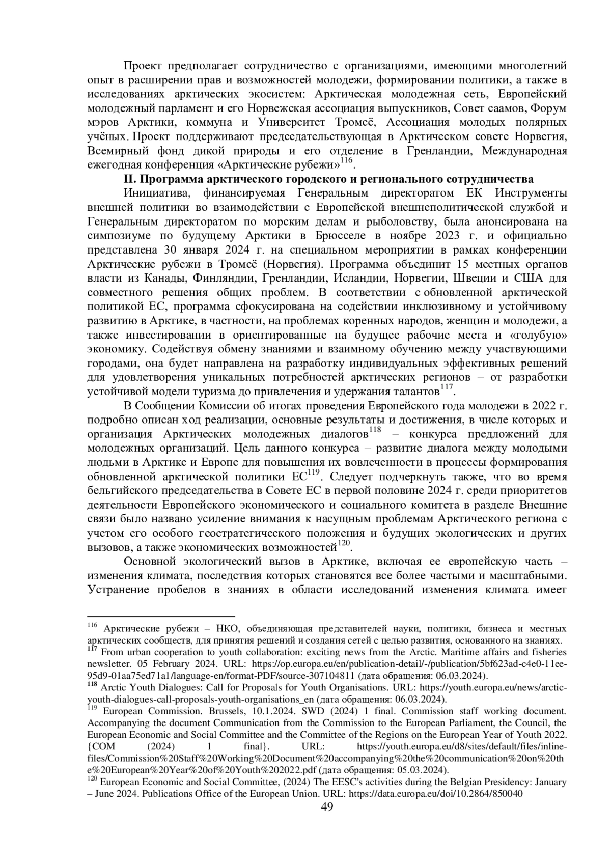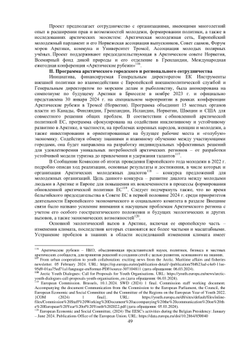 Одна из ключевых целей арктической политики ЕС, изложенной в 2021 г. в Совместном сообщении Европейской комиссии (ЕК, Комиссия) и Высокого представителя ЕС по иностранным делам и политике безопасности «Более активное участие ЕС для мирной, устойчивой и процветающей Арктики»,114 – поддерживать комплексное, инклюзивное и устойчивое развитие европейских арктических регионов на благо их нынешних жителей и будущих поколений, уделяя особое внимание потребностям коренных народов, женщин и молодежи, а также инвестируя в перспективные рабочие места, в том числе в «голубую» экономику. Для реализации поставленных социально-экономических задач в европейской Арктике, то есть на заполярных территориях Финляндии и Швеции, а также в Гренландии (сотрудничество с которой – одно из восьми основных направлений действий Союза в высоких северных широтах115), Норвегии и Исландии, ЕС тесно сотрудничает с различными заинтересованными сторонами на разных уровнях, включая местные, региональные, национальные и панарктические группы. Это происходит, например, в рамках таких мероприятий, как Арктический форум ЕС высокого уровня, Диалог коренных народов, Арктические молодежные диалоги