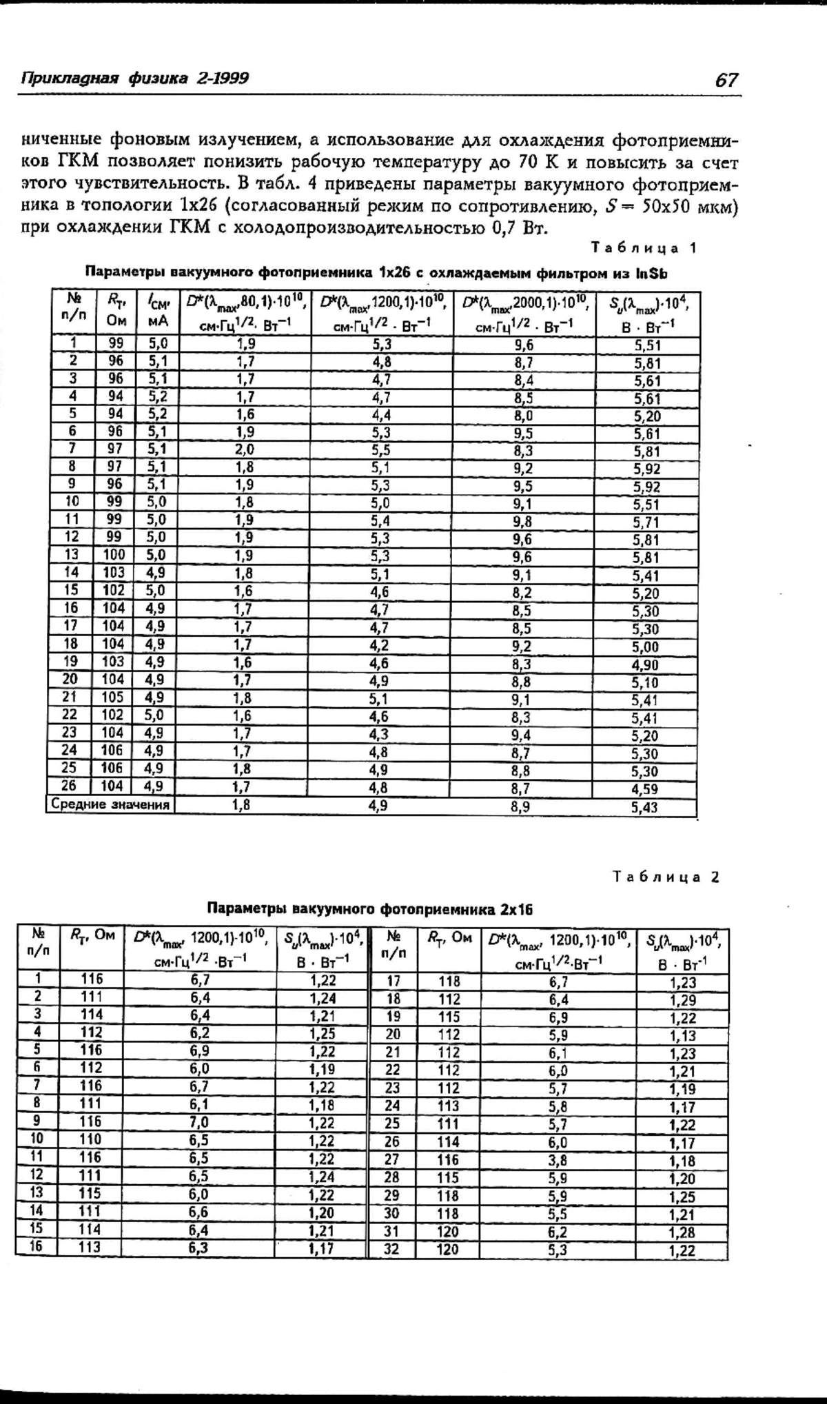 Высокая точность обработки поверхностей ФП, предназначенных для стыковки с системой охлаждения, позволяет для обеспечения рабочей температуры 70-80 К использовать дроссельные разомкнутые или замкнутые системы охлаждения, а также микрокриогенные системы с газовыми криогенными машинами типа Стирлинга или Сплит-Стирлинга. С учетом высоких фотоэлектрических параметров представленные вакуумные фотоприемники могут приzменяться в тепловизионных приборах и системах различного назначения.