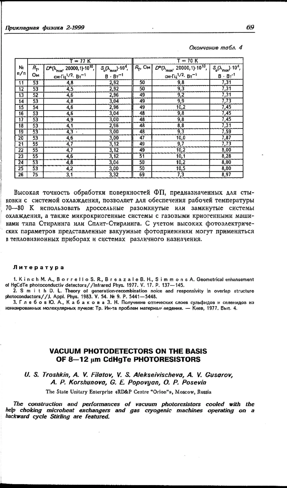 1. K i n c h M. A., B o r r e l l o S. R., B r e a z a l e B. H., S i m m o n s A. Geometrical enhansement of HgCdTe photoconductiv detectors//Infrared Phys. 1977. V. 17. P. 137-145.