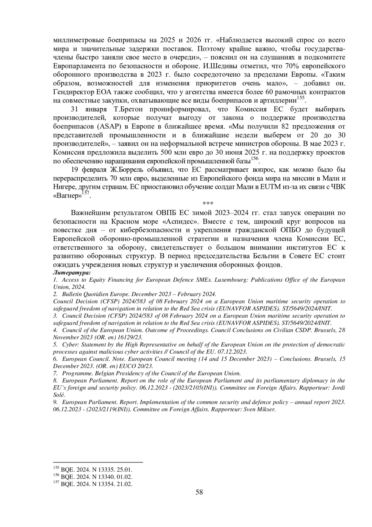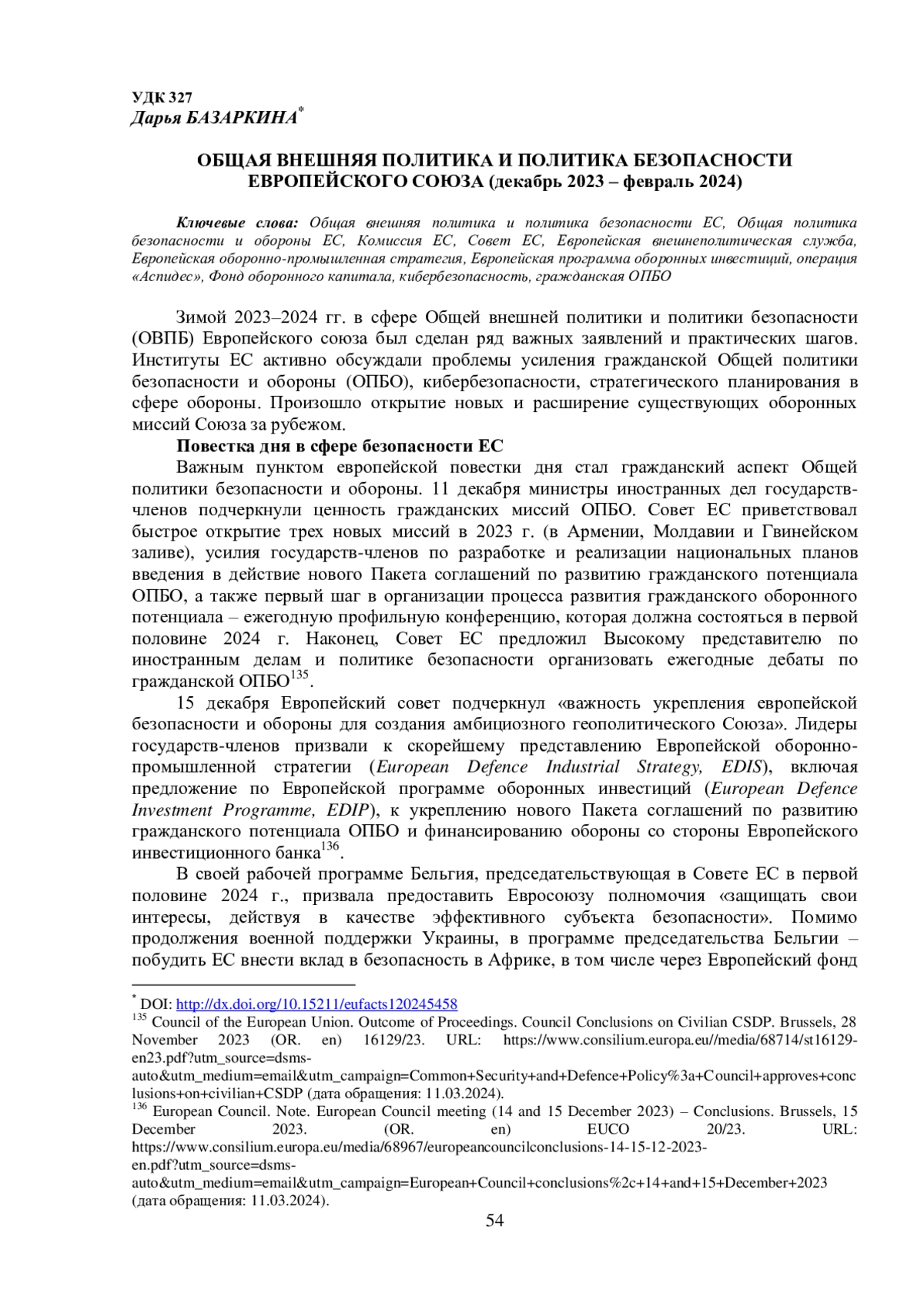 Зимой 2023–2024 гг. в сфере Общей внешней политики и политики безопасности (ОВПБ) Европейского союза был сделан ряд важных заявлений и практических шагов. Институты ЕС активно обсуждали проблемы усиления гражданской Общей политики безопасности и обороны (ОПБО), кибербезопасности, стратегического планирования в сфере обороны. Произошло открытие новых и расширение существующих оборонных миссий Союза за рубежом