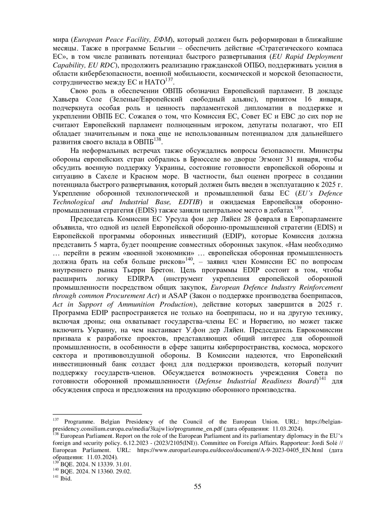 Испанское председательство в ЕС столкнулось с существенными проблемами при продвижении стратегической повестки Союза в сфере безопасности и обороны, хотя Мадриду удалось обеспечить общность позиций государств-членов в отношении активизации институционального и практического сотрудничества по укреплению оборонного и оперативного потенциала. Гранадский саммит Европейского политического сообщества 4-5 октября 2023 г. стал платформой для продвижения планов формирования европейской обороной автономии122, однако выработка конкретных решений, вполне ожидаемо, была перенесена на 2024 г