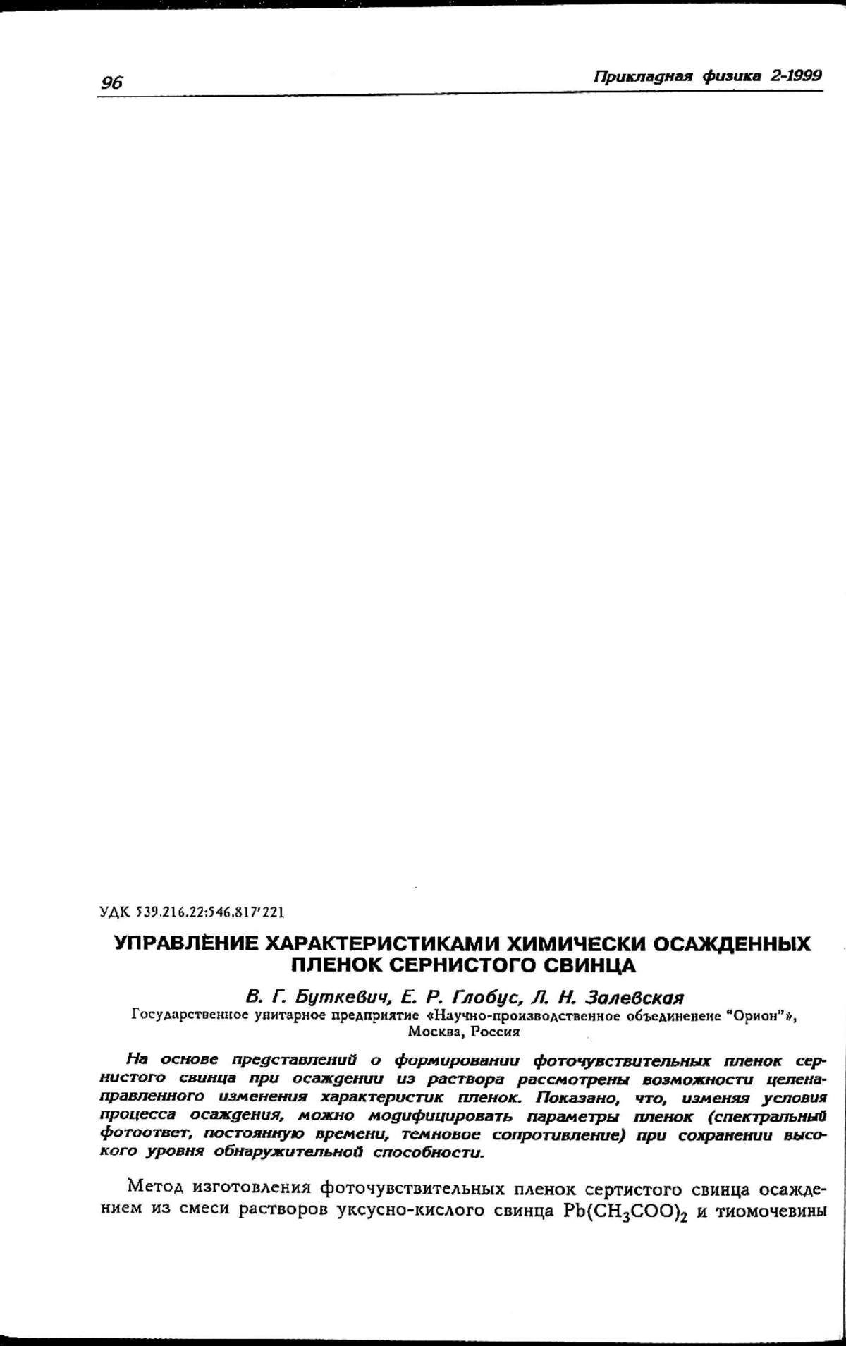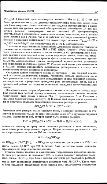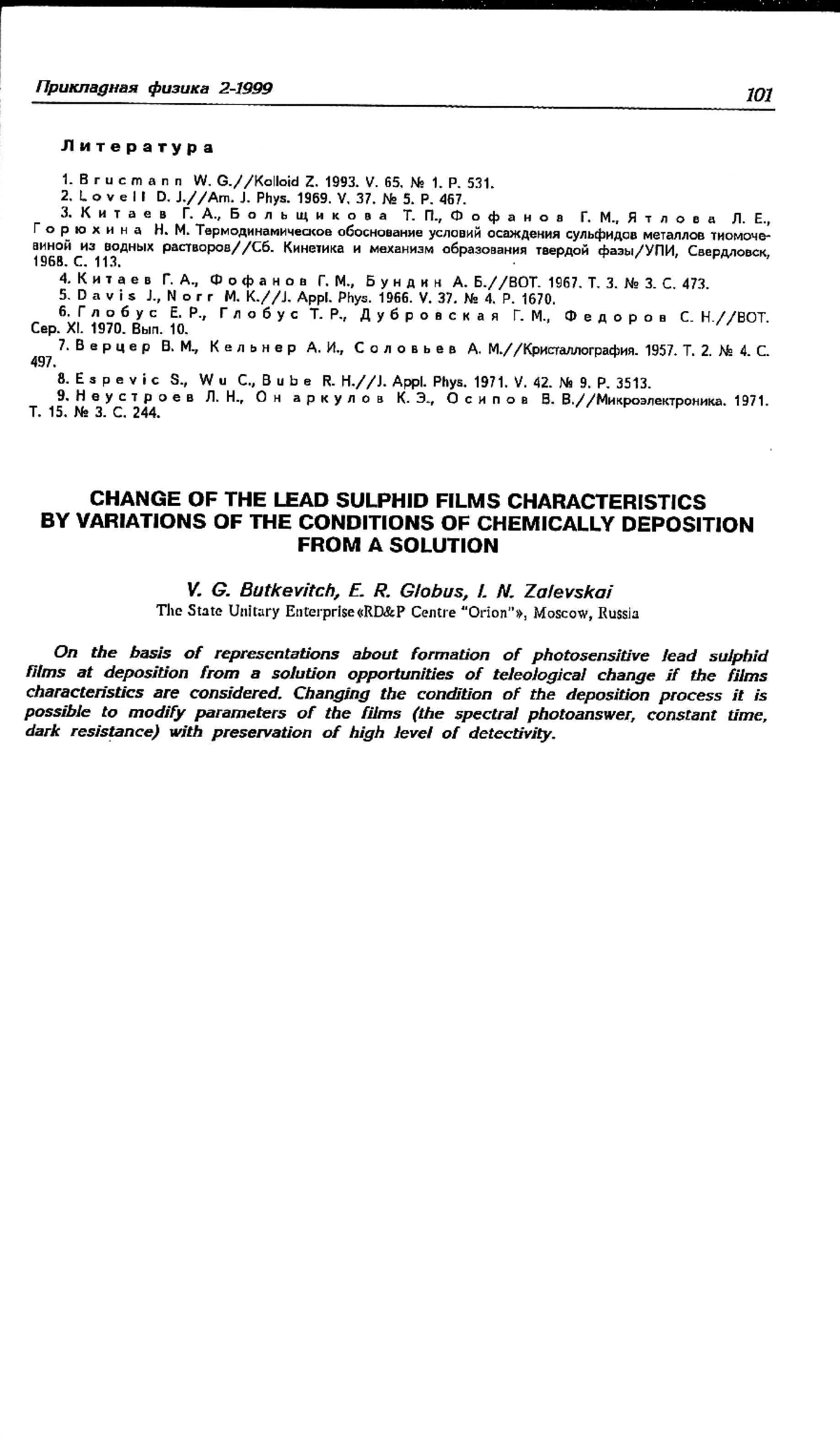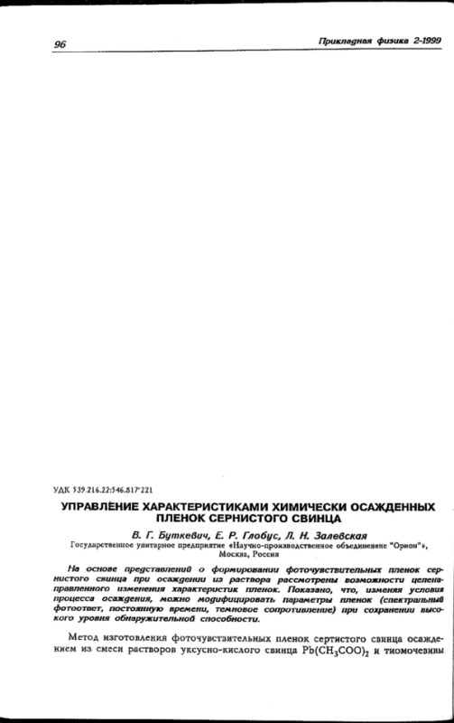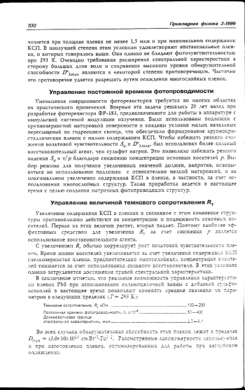 В заключение отметим, что реальные возможности управления характеристики пленок PbS при использовании сильнощелочной ванны с добавкой сульфоксисолей в настоящее время позволяют изменять средние значения их параметров в следующих пределах (Т = 293 К):