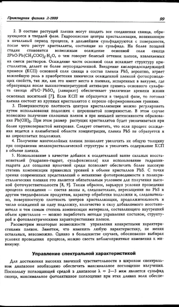 На основе представлений о формировании фоточувствительных пленок сернистого свинца при осаждении из раствора рассмотрены возможности целенаправленного изменения характеристик пленок. Показано, что, изменяя условия процесса осаждения, можно модифицировать параметры пленок (спектральный фотоответ, постоянную времени, темновое сопротивление) при сохранении высокого уровня обнаружительной способности.