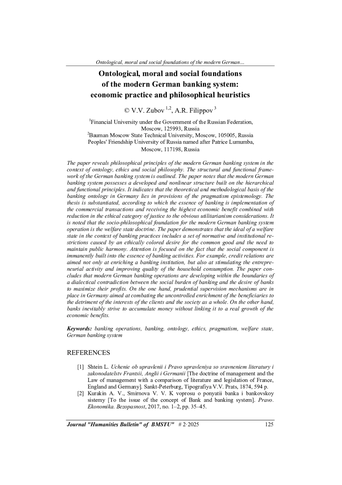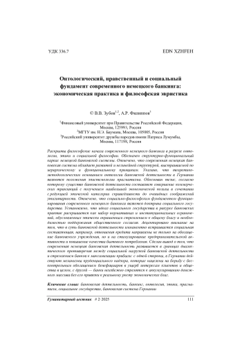 Раскрыты философские начала современного немецкого банкинга в разрезе онтологии, этики и социальной философии. Обозначен структурно-функциональный каркас немецкой банковской системы. Отмечено, что современная немецкая банковская система обладает развитой и нелинейной структурой, выстраиваемой по иерархическому и функциональному принципам. Указано, что теоретикометодологическим основанием онтологии банковской деятельности в Германии являются положения эпистемологии прагматизма. Обоснован тезис, согласно которому существо банковской деятельности составляет совершение коммерческих транзакций с получением наибольшей экономической пользы в сочетании с редукцией этической категории справедливости до очевидных соображений утилитарности. Отмечено, что социально-философским фундаментом функционирования современного немецкого банкинга является доктрина социального государства. Установлено, что идеал социального государства в ракурсе банковских практик раскрывается как набор нормативных и институциональных ограничений, обусловленных этически окрашенным стремлением к общему благу и необходимостью поддержания общественного согласия. Акцентировано внимание на том, что в суть банковской деятельности имманентно встраивается социальная составляющая, например, отношения кредита направлены не только на обогащение банковского учреждения, но и на стимулирование предпринимательской активности и повышение качества бытового потребления. Сделан вывод о том, что современная немецкая банковская деятельность развивается в границах диалектического противоречия между социальной нагрузкой банковской деятельности и стремлением банков к максимизации прибыли: с одной стороны, в Германии действуют механизмы пруденциального надзора, которые нацелены на борьбу с бесконтрольным обогащением бенефициаров в ущерб интересам клиентов и общества в целом, с другой — банки неизбежно стремятся к аккумулированию денежного массива без его привязки к реальному росту экономических благ.