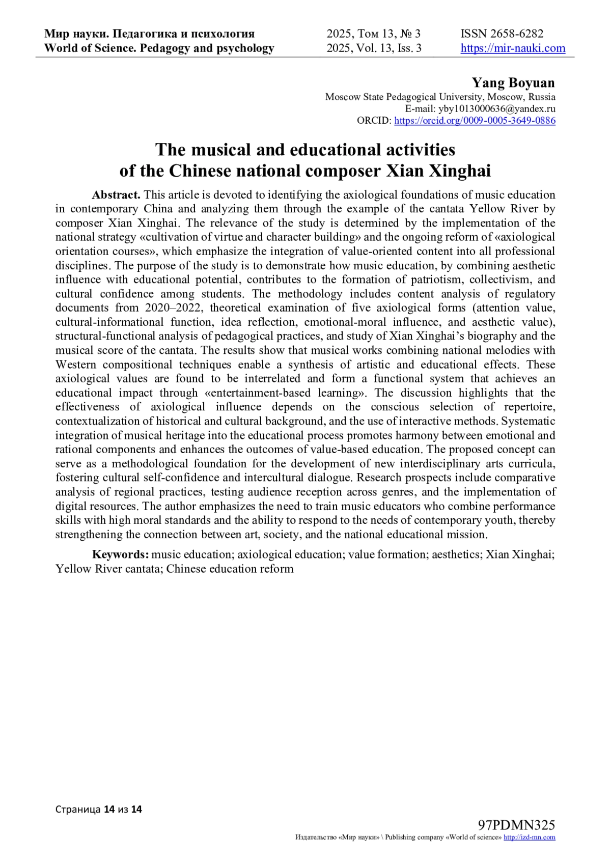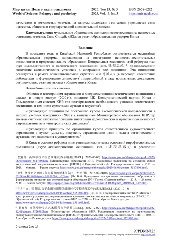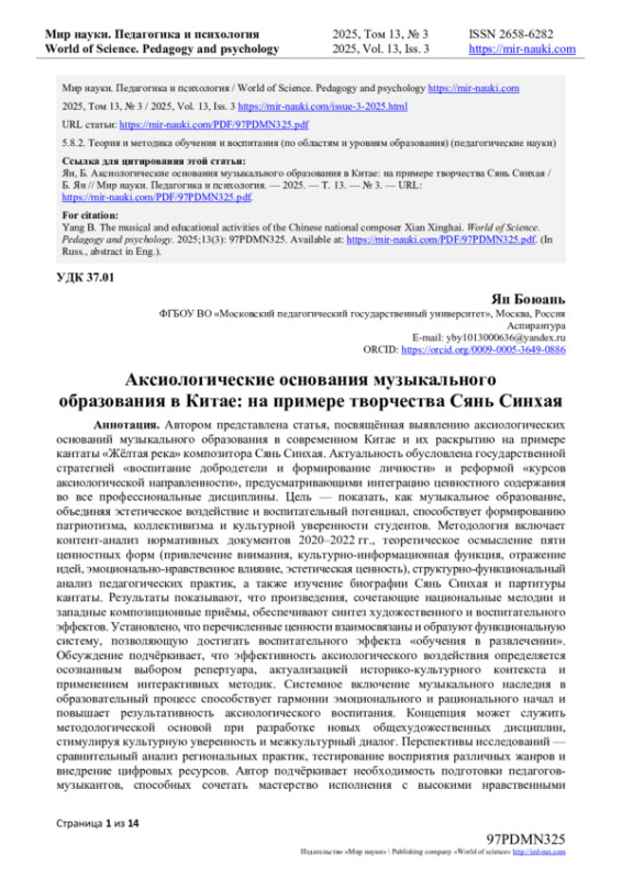 Автором представлена статья, посвящённая выявлению аксиологических оснований музыкального образования в современном Китае и их раскрытию на примере кантаты «Жёлтая река» композитора Сянь Синхая. Актуальность обусловлена государственной стратегией «воспитание добродетели и формирование личности» и реформой «курсов аксиологической направленности», предусматривающими интеграцию ценностного содержания во все профессиональные дисциплины.
