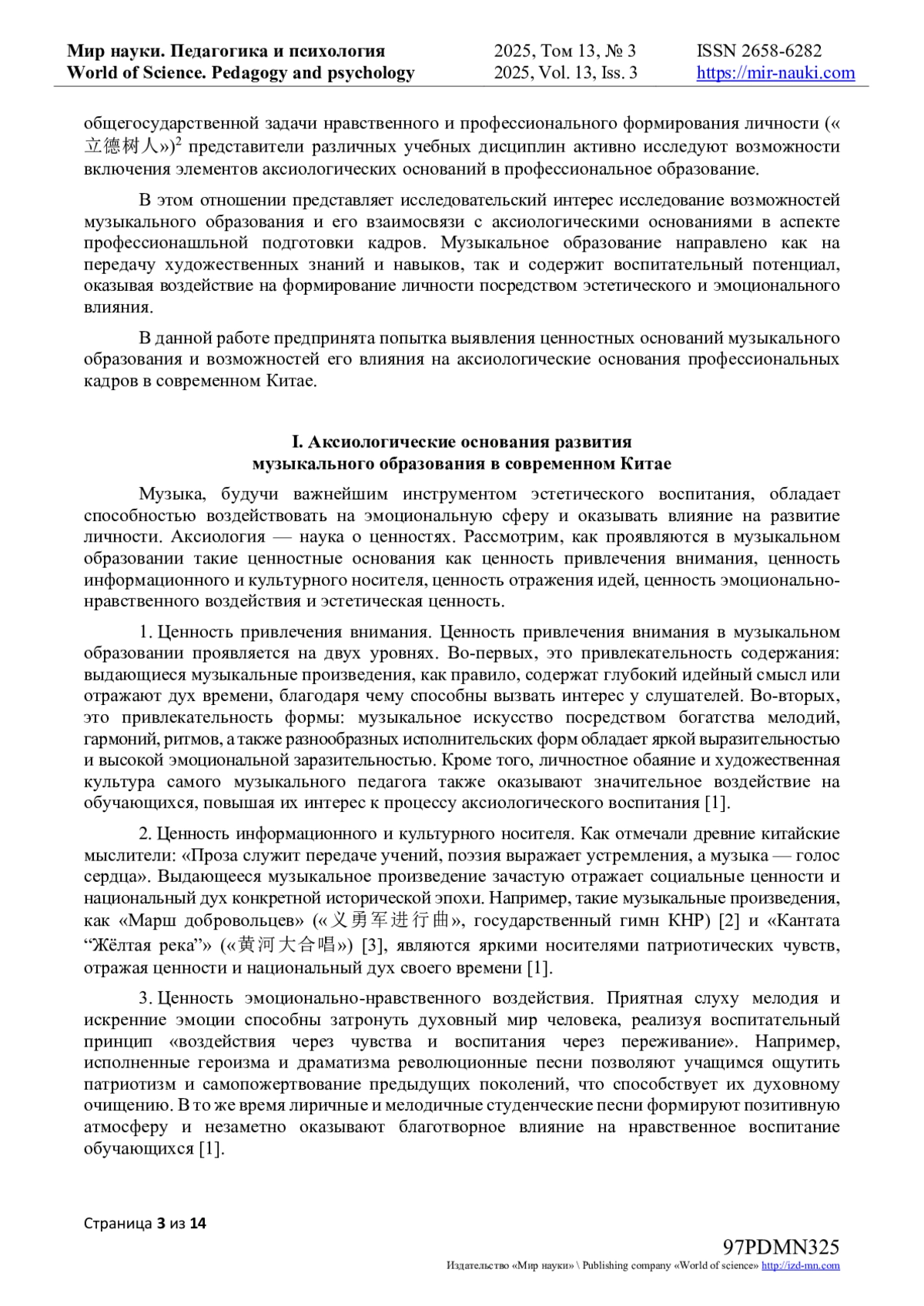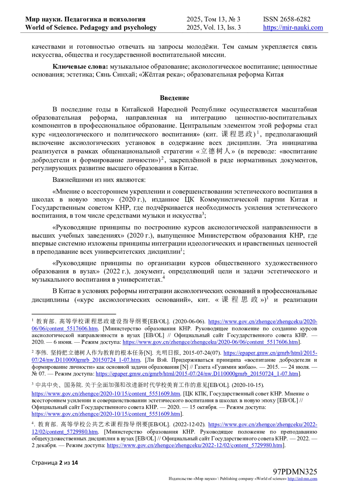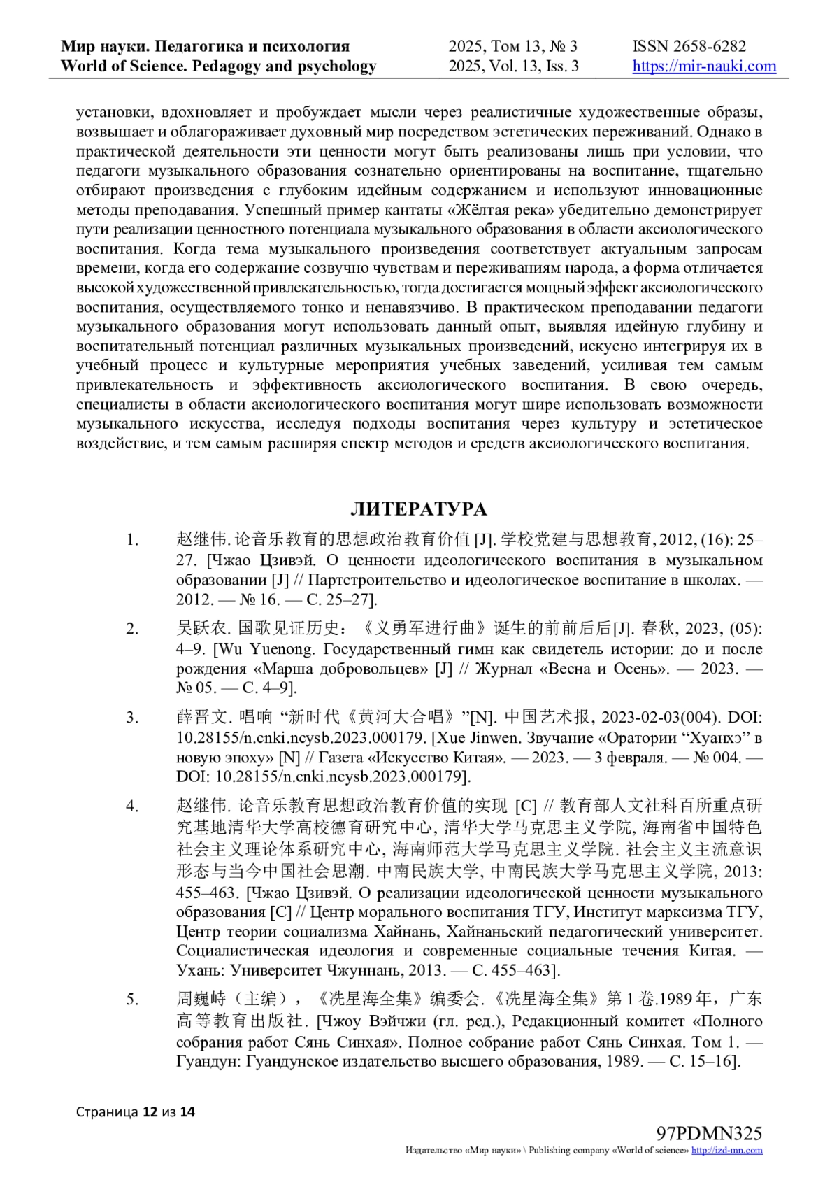1. 赵继伟. 论音乐教育的思想政治教育价值 [J]. 学校党建与思想教育, 2012, (16): 25-27. [Чжао Цзивэй. О ценности идеологического воспитания в музыкальном образовании [J] // Партстроительство и идеологическое воспитание в школах. - 2012. - № 16. - С. 25-27].