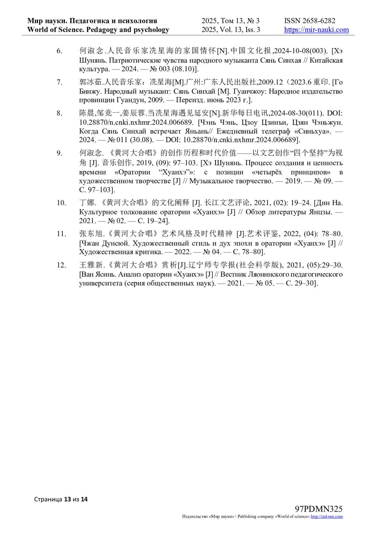 10. 丁娜. 《黄河大合唱》的文化阐释 [J]. 长江文艺评论, 2021, (02): 19-24. [Дин На. Культурное толкование оратории “Хуанхэ” [J] // Обзор литературы Янцзы. - 2021. - № 02. - С. 19-24].