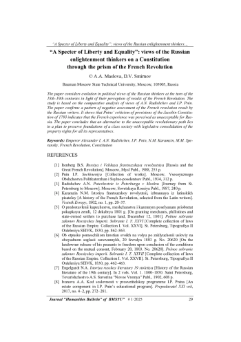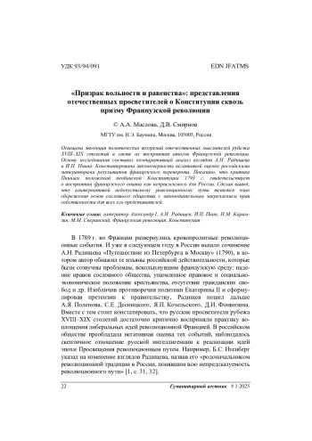В 1789 г. во Франции развернулись кровопролитные революционные события. И уже в следующем году в России вышло сочинение А. Н. Радищева «Путешествие из Петербурга в Москву» (1790), в котором автор обнажил те изъяны российской действительности, которые были созвучны проблемам, всколыхнувшим французскую среду: падение нравов сословного общества, ущемленное правовое и социальноэкономическое положение крестьянства, отсутствие гражданских свобод и др. Изобличив противоречия политики Екатерины II и сформулировав претензии к правительству, Радищев пошел дальше А. Я. Поленова, С. Е. Десницкого, Я. П. Козельского, Д. И. Фонвизина. Вместе с тем стоит констатировать, что русские просветители рубежа XVIII–XIX столетий достаточно критично восприняли практику воплощения либеральных идей революционной Францией. В российском обществе преобладала негативная оценка тех событий, наблюдалось скептичное отношение русской интеллигенции к реализации идей эпохи Просвещения революционным путем. Например, Б. С. Итенберг указал на изменение взглядов Радищева, назвав его «родоначальником революционной традиции в России, понявшим всю непредсказуемость революционного пути» [1, с. 31, 32].