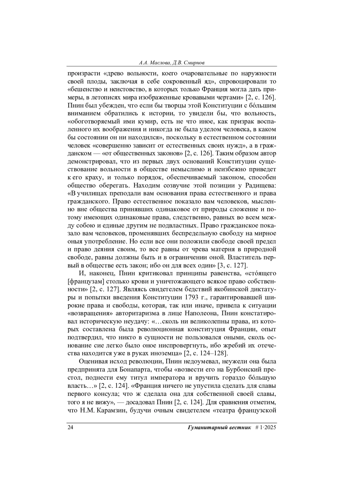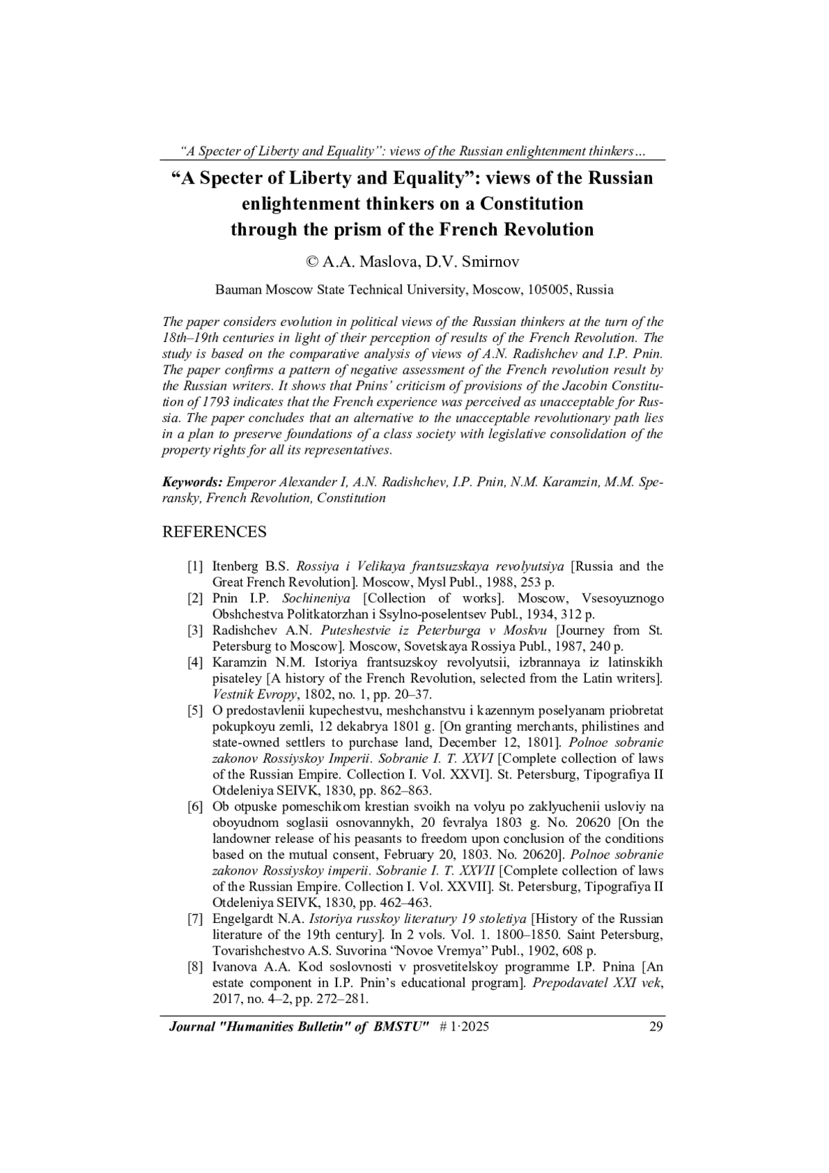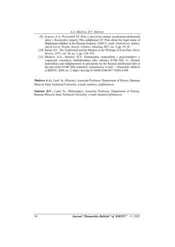 11. Маслова А.А., Смирнов Д.В. Французский материализм и просветительство в восприятии российской интеллектуальной элиты рубежа XVIII-XIX вв. Гуманитарный вестник, 2024, вып. 2.