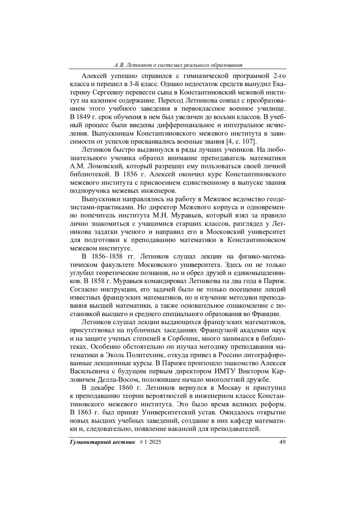 Показан жизненный путь профессора Императорского московского технического училища Алексея Васильевича Летникова, проанализированы его взгляды на системы реального образования в странах Европы и рассмотрены предложения о создании реальных училищ в России в контексте подготовки школьной реформы в России. Сделан вывод, что позицию А. В. Летникова по вопросам развития отечественного среднего образования следует признать рациональной, основанной на глубоком знании европейского опыта и российских реалий. Его предложения с некоторыми изменениями были реализованы в «Уставе реальных училищ ведомства Министерства Народного Просвещения» 1872 г.