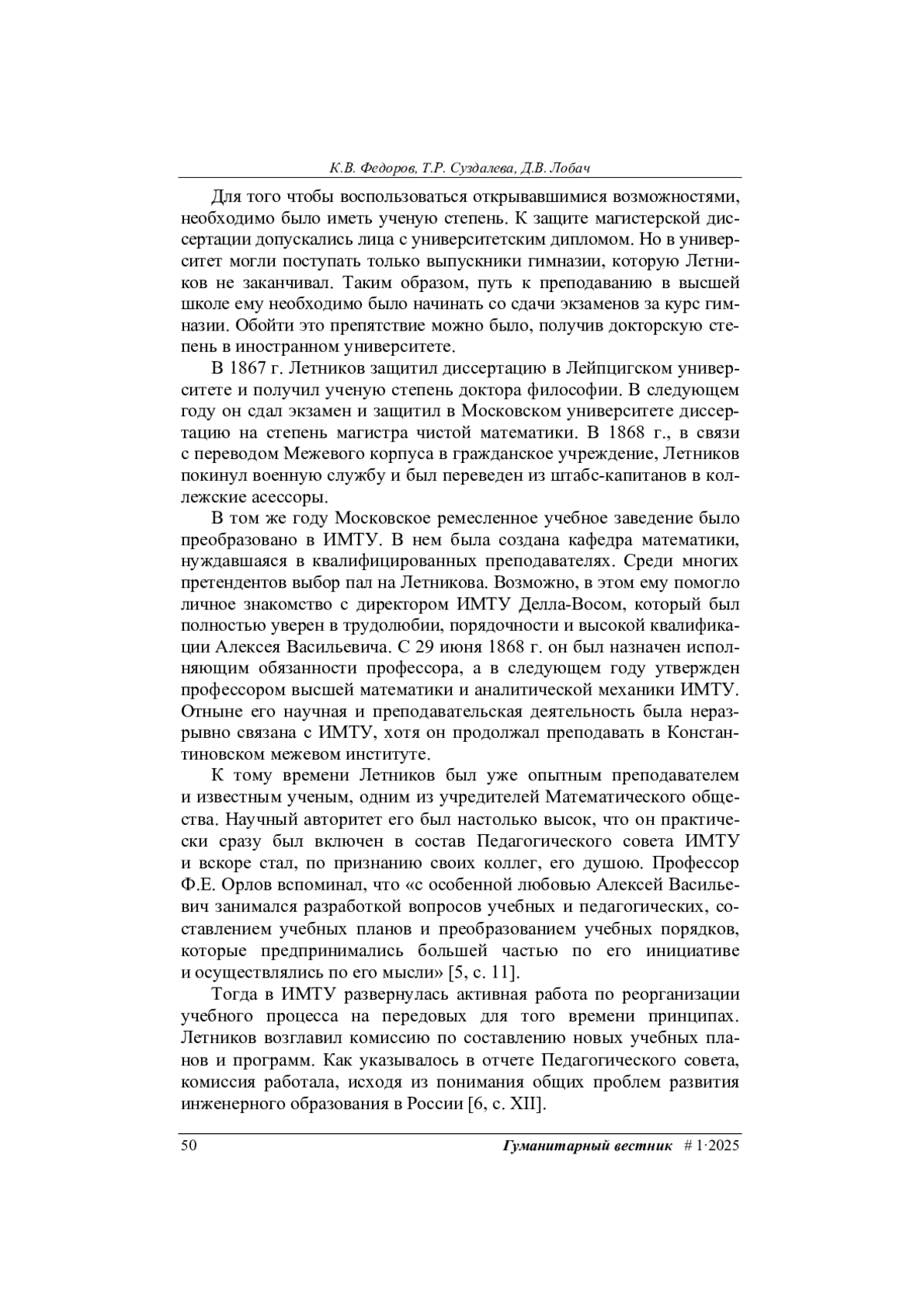 Жизненный путь профессора Императорского московского технического училища (ИМТУ) Алексея Васильевича Летникова довольно подробно описан его друзьями и коллегами Н. А. Шапошниковым [1] и Ф. А. Слудским [2]. Серьезное историко-математическое исследование, посвященное А. В. Летникову, опубликовал преподаватель МВТУ им. Н. Э. Баумана Р. Я. Шостак [3]. Все авторы искренне восхищаются человеческими качествами Алексея Васильевича и высоко оценивают его вклад в развитие отечественной математической науки. Однако только Шостак упоминает об участии Летникова в дискуссии о школьной реформе 1872 г., хотя, по мнению авторов настоящей статьи, этот эпизод весьма ярко характеризует его педагогические взгляды [3, c. 171].