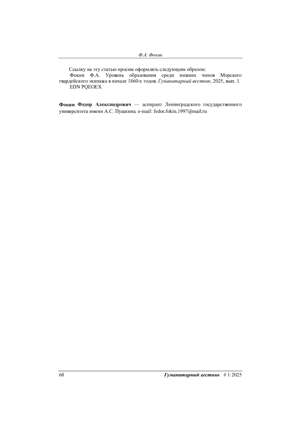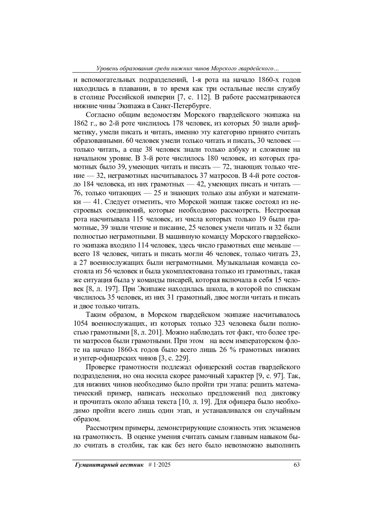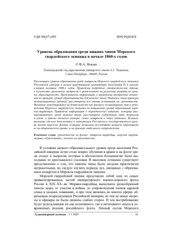 Рассмотрен уровень образования среди матросов Морского гвардейского экипажа Российской империи в начале царствования императора Александра II, а именно в первой половине 1860-х годов. Приведены подробные статистические данные о количестве грамотных матросов, с разделениями на различные разряды по уровню образованности. Представлена информация о проведении внутренних экзаменов по проверке уровня образованности для нижних чинов Экипажа, даны примеры экзаменационных заданий, рассмотрены все этапы испытания на грамотность. Внимание акцентировано на деятельности как высшего командования, так и руководства Морского гвардейского экипажа по повышению уровня образования моряков-гвардейцев. Приведена информация о периодических изданиях, которые распространялись среди нижних чинов, рассмотрено содержание этих журналов и газет, а также отмечен интерес самих матросов к этим изданиям. Большое внимание уделено документам и материалам Российского государственного архива военно-морского флота, которые позволили исследовать вопросы образования не на общевоинском уровне, а на примере отдельного подразделения.