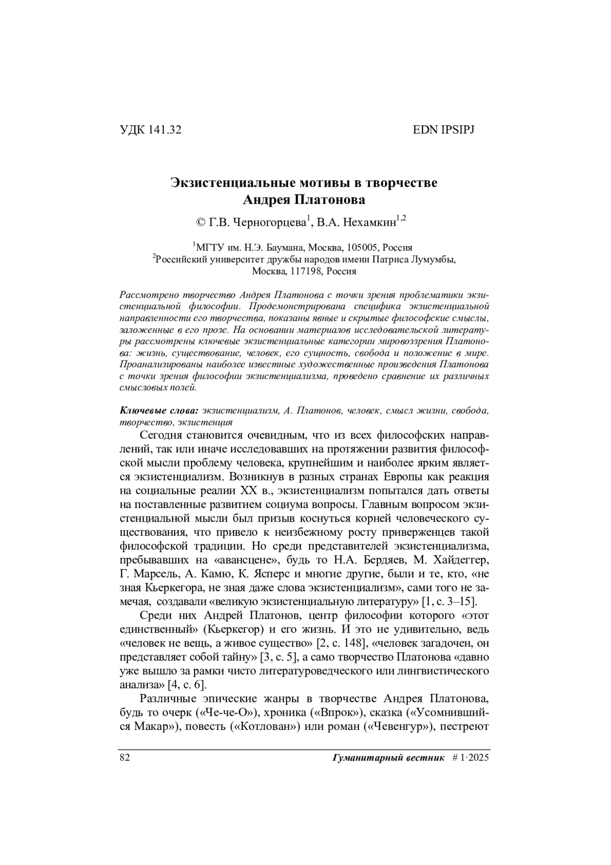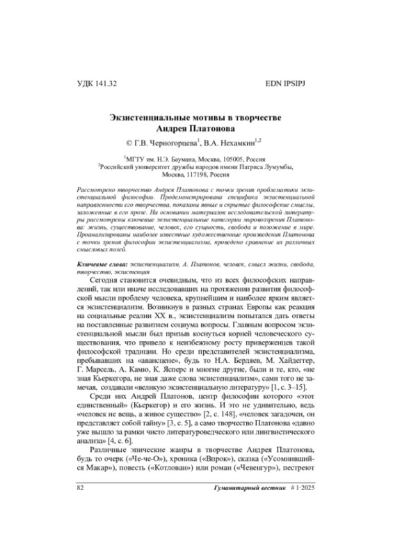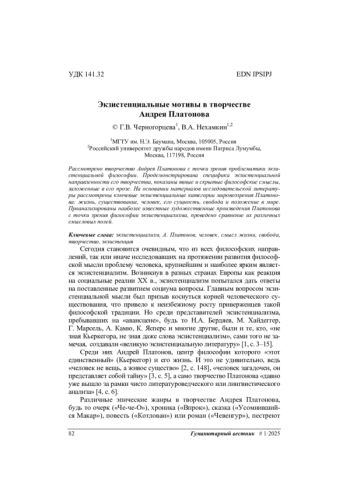 Рассмотрено творчество Андрея Платонова с точки зрения проблематики экзистенциальной философии. Продемонстрирована специфика экзистенциальной направленности его творчества, показаны явные и скрытые философские смыслы, заложенные в его прозе. На основании материалов исследовательской литературы рассмотрены ключевые экзистенциальные категории мировоззрения Платонова: жизнь, существование, человек, его сущность, свобода и положение в мире. Проанализированы наиболее известные художественные произведения Платонова с точки зрения философии экзистенциализма, проведено сравнение их различных смысловых полей.