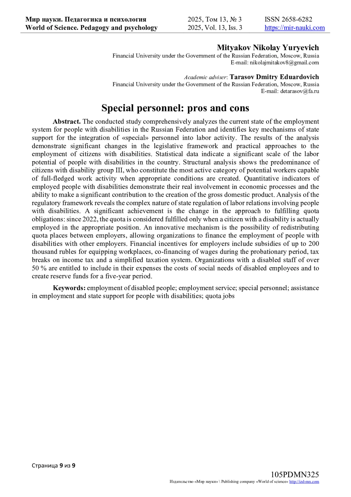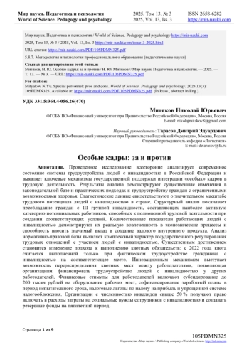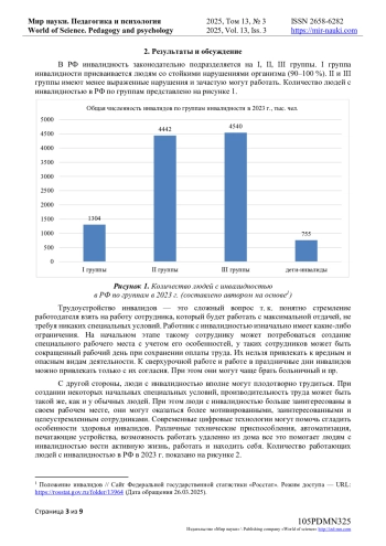 Проведенное исследование всесторонне анализирует современное состояние системы трудоустройства людей с инвалидностью в Российской Федерации и выявляет ключевые механизмы государственной поддержки интеграции «особых» кадров в трудовую деятельность. Результаты анализа демонстрируют существенные изменения в законодательной базе и практических подходах к трудоустройству граждан с ограниченными возможностями здоровья. Статистические данные свидетельствуют о значительном масштабе трудового потенциала людей с инвалидностью в стране. Структурный анализ показывает преобладание граждан с III группой инвалидности, составляющих наиболее активную категорию потенциальных работников, способных к полноценной трудовой деятельности при создании соответствующих условий. Количественные показатели работающих людей с инвалидностью демонстрируют их реальную вовлеченность в экономические процессы и способность вносить значимый вклад в создание валового внутреннего продукта. Анализ нормативно-правовой базы выявляет комплексный характер государственного регулирования трудовых отношений с участием людей с инвалидностью. Существенным достижением становится изменение подхода к выполнению квотных обязательств: с 2022 года квота считается выполненной только при фактическом трудоустройстве гражданина с инвалидностью на соответствующее место. Инновационным механизмом выступает возможность перераспределения квотных мест между работодателями, позволяющая организациям финансировать трудоустройство людей с инвалидностью у других работодателей. Финансовые стимулы для работодателей включают субсидирование до 200 тысяч рублей на оборудование рабочих мест, софинансирование заработной платы в период испытательного срока, налоговые льготы по налогу на прибыль и упрощенной системе налогообложения. Организации с численностью инвалидов свыше 50 % получают право включать в расходы затраты на социальные нужды сотрудников с инвалидностью и создавать резервные фонды на пятилетний период.