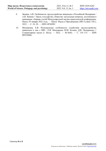 10. Моцовкина, Е.В. Региональные особенности содействия трудоустройству инвалидов и лиц с ОВЗ / Е.В. Моцовкина, Ю.В. Козина, Д.В. Оноприенко // Гуманитарные науки (г. Ялта). - 2022. - № 4(60). - С. 110-115. EDN: BNYDMG