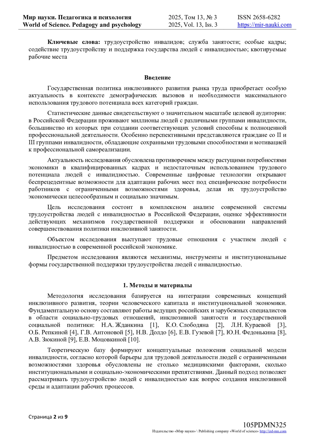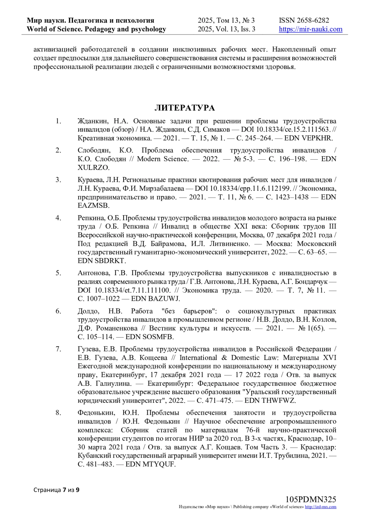 2. Слободян, К.О. Проблема обеспечения трудоустройства инвалидов / К.О. Слободян // Modern Science. - 2022. - № 5-3. - С. 196-198. EDN: XULRZO