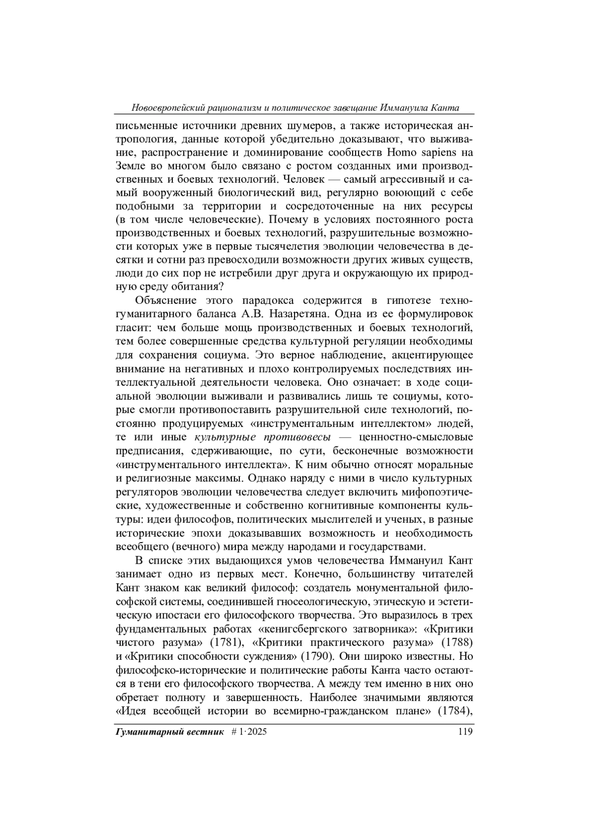 Проанализированы основные философские, научные и политические идеи Нового времени и эпохи Просвещения, трактат И. Канта «К вечному миру». Подробно рассмотрены сочинения Уильяма Пенна «Опыт о настоящем и будущем мире в Европе путем создания европейского Конгресса, Парламента или Палаты государств» (1693) и «Проект вечного мира в Европе» французского аббата Шарля Ирине де Сен-Пьера (1713–1717), идеи Ш. Монтескье и Ж.-Ж. Руссо. Показано, что в идейно-политическом отношении трактат Канта был шагом вперед по сравнению с работами его предшественников. Отмечено, что проекты Уильяма Пенна и де Сен-Пьера в значительной мере оказались реализованными в политической практике второй половины ХХ — начале XXI в., а проект Канта ожидала иная судьба: ни одна из ключевых статей Договора «К вечному миру» до сих пор не воплощена в жизнь. Доказано, что сегодня в условиях эскалации гонки вооружений и роста военных конфликтов трактат Канта остается архиактуальным. Его следует рассматривать как политическое завещание великого философа современным политикам и государственным деятелям.
