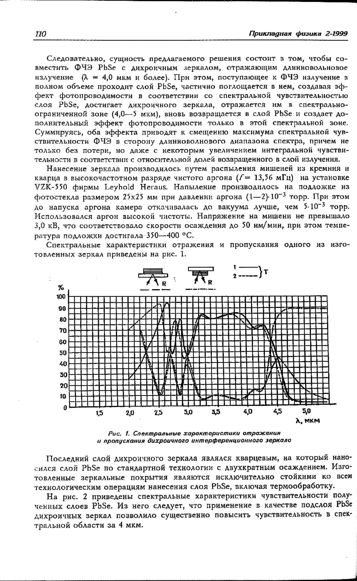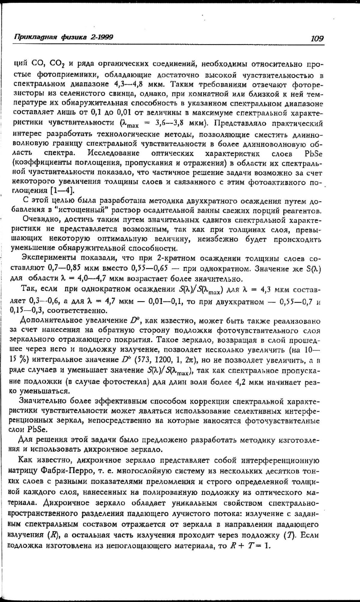 Таким образом использование в качестве подложек слоев PbSe дихроичных зеркал позволяет существенно, в несколько раз, увеличить Sl при l = 4,0 мкм и более по сравнению со значениями, получаемыми при изготовлении ФЧЭ по стандартной технологии.