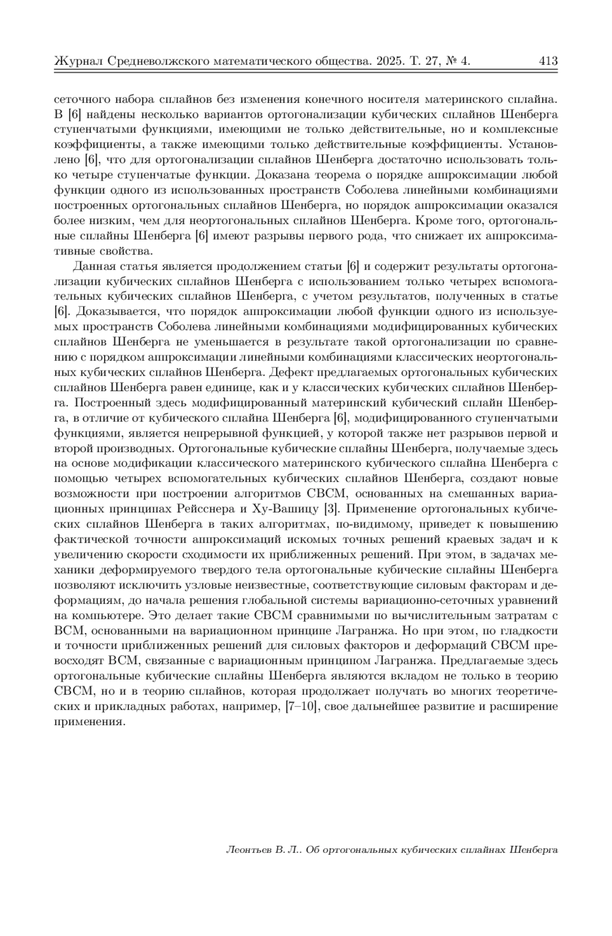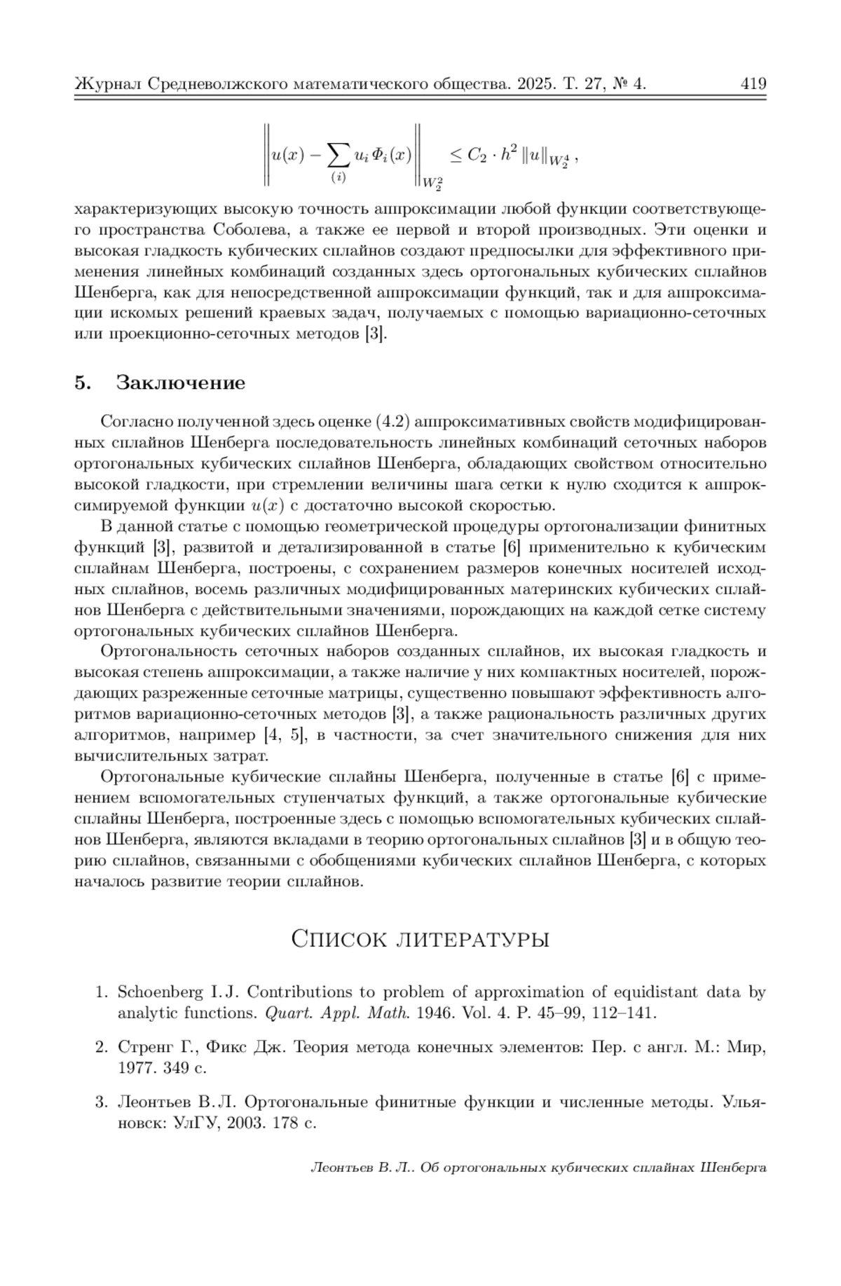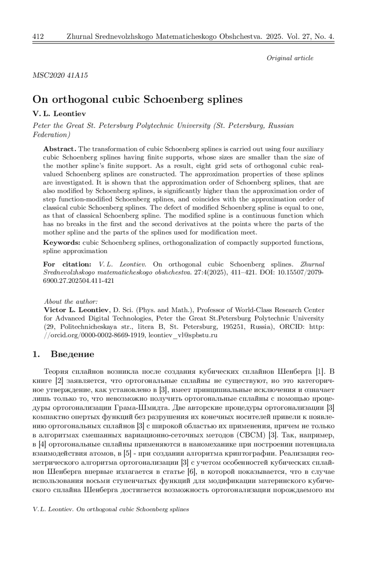 Проводится трансформация кубических сплайнов Шенберга с помощью четырех вспомогательных кубических сплайнов Шенберга, имеющих конечные носители, размеры которых меньше по сравнению с размером конечного носителя материнского сплайна. В результате построены восемь сеточных наборов ортогональных кубических сплайнов Шенберга, имеющих действительные значения. Выполнено исследование аппроксимативных свойств построенных ортогональных кубических сплайнов Шенберга. Показано, что порядок аппроксимации сплайнами Шенберга, модифицированными также сплайнами Шенберга, существенно выше по сравнению с порядком аппроксимации сплайнами Шенберга, модифицированными ступенчатыми функциями, и совпадает с порядком аппроксимации классическими кубическими сплайнами Шенберга. Дефект модифицированного сплайна Шенберга равен единице, как у классического сплайна Шенберга. Модифицированный сплайн является непрерывной функцией, у которой в точках сопряжения друг с другом частей материнского сплайна и частей сплайнов, используемых для модификации, нет разрывов также первой и второй производных.